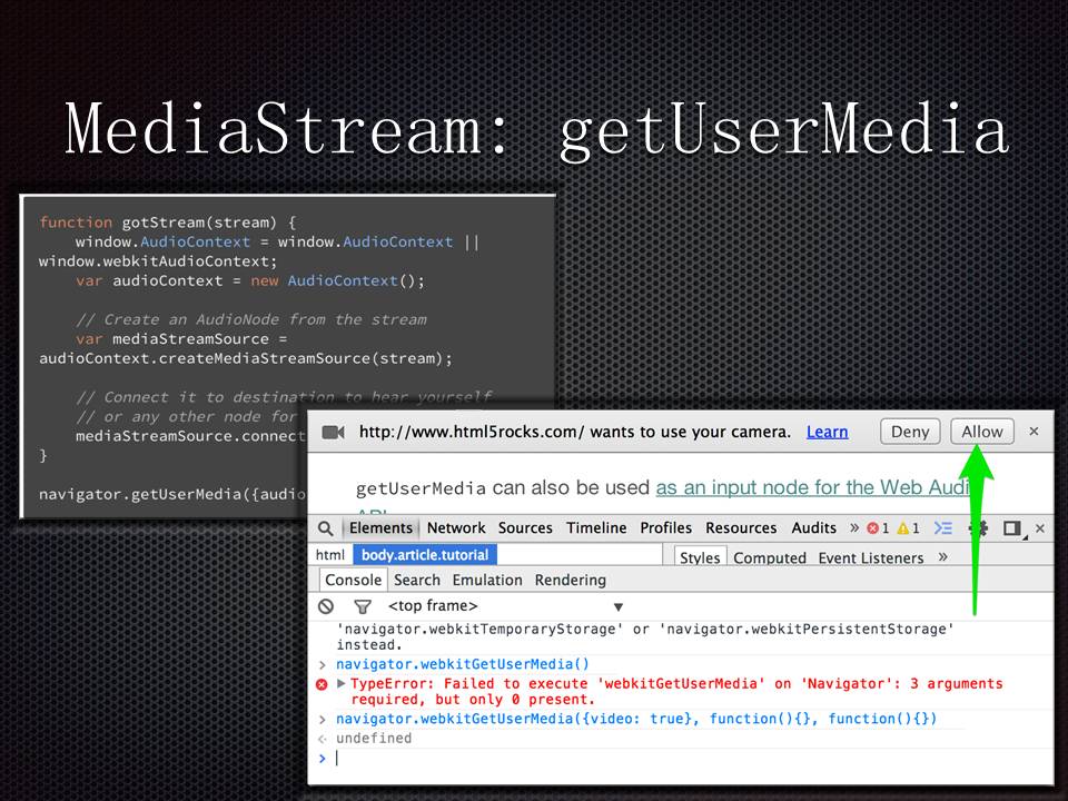 MediaStream (aka getUserMedia)get access to data streams, such as from the user's camera and microphone.