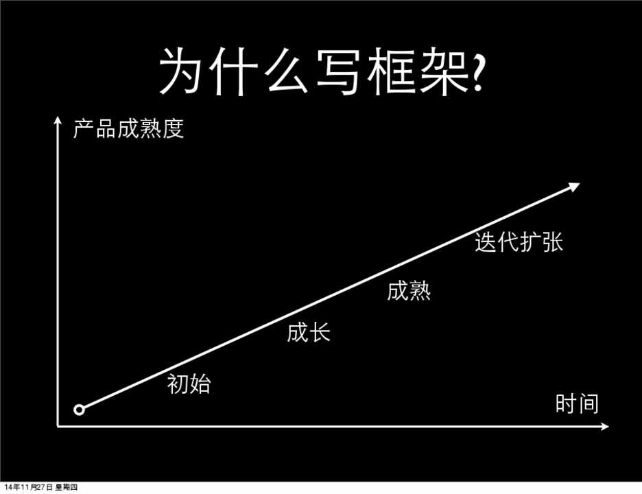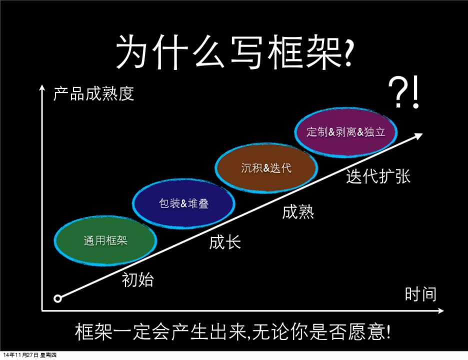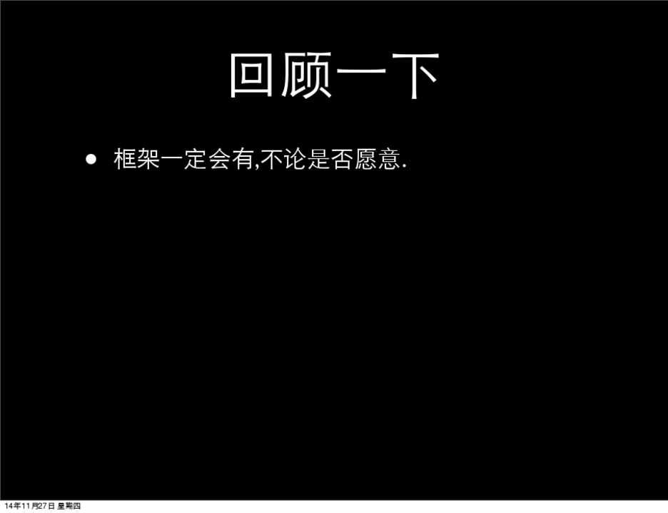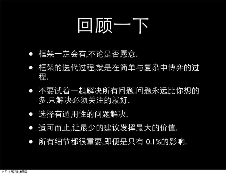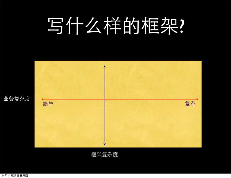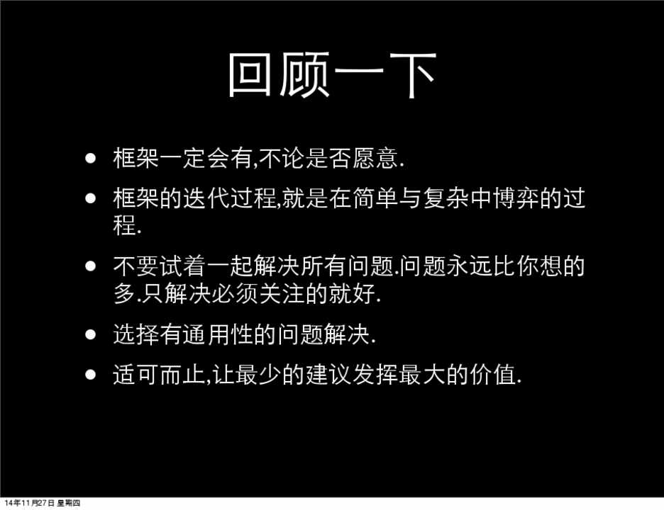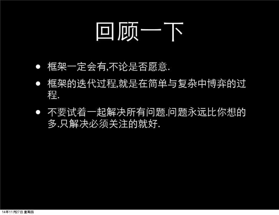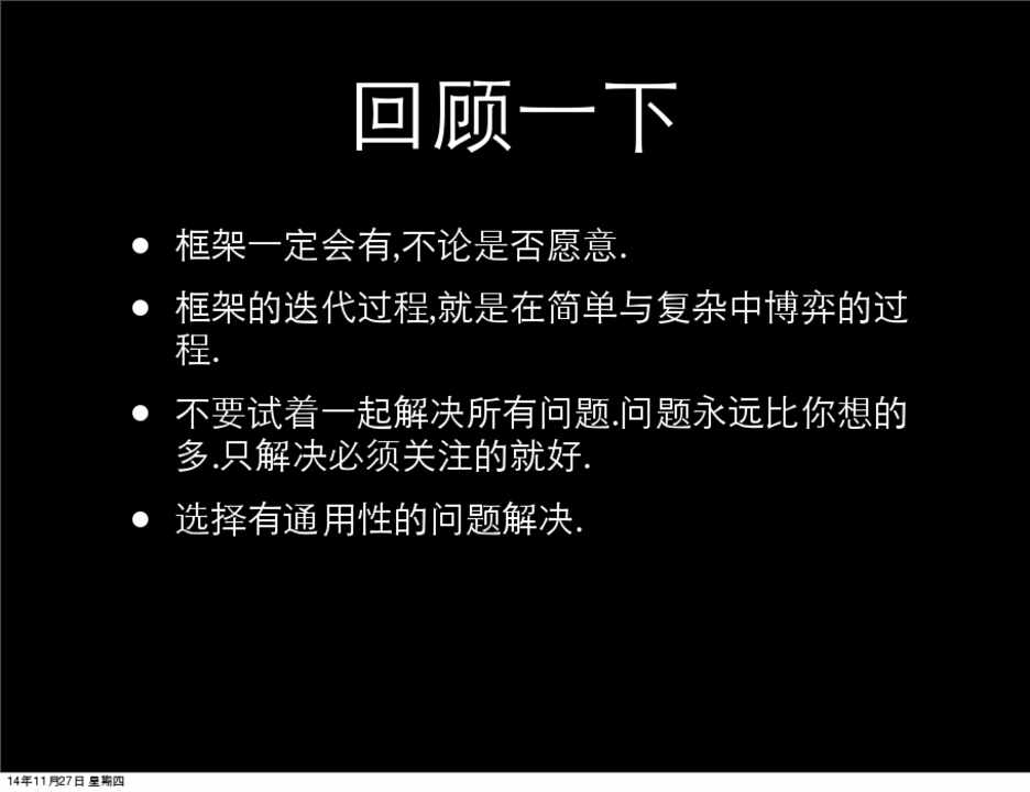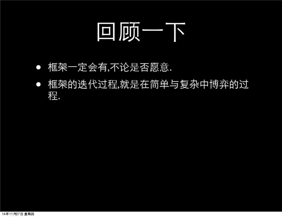 • 框架⼀一定会有,不论是否愿意. • 框架的迭代过程,就是在简单与复杂中博弈的过