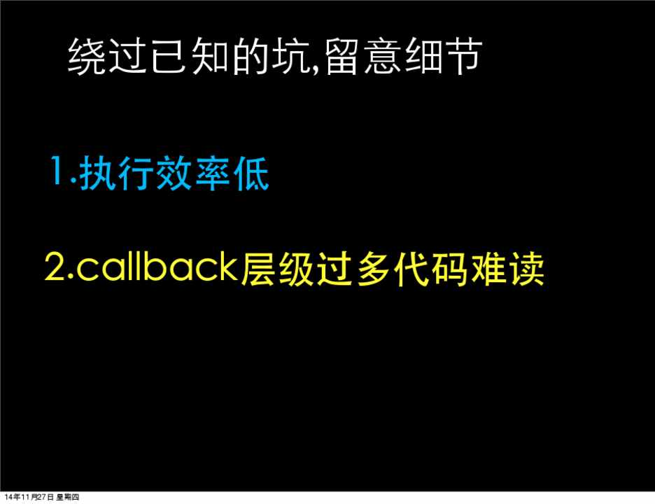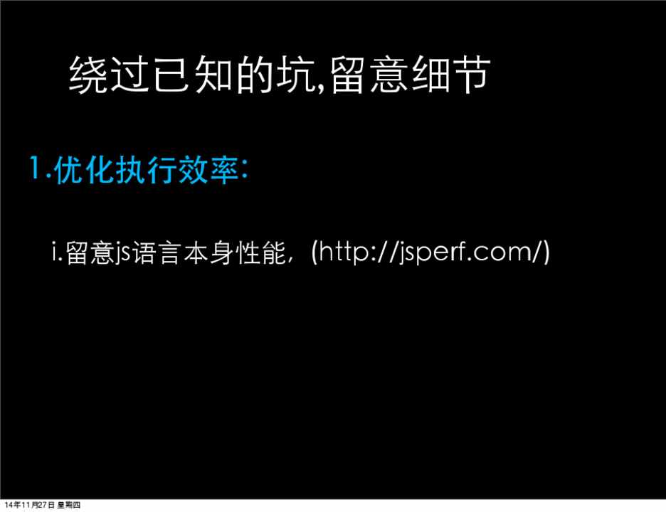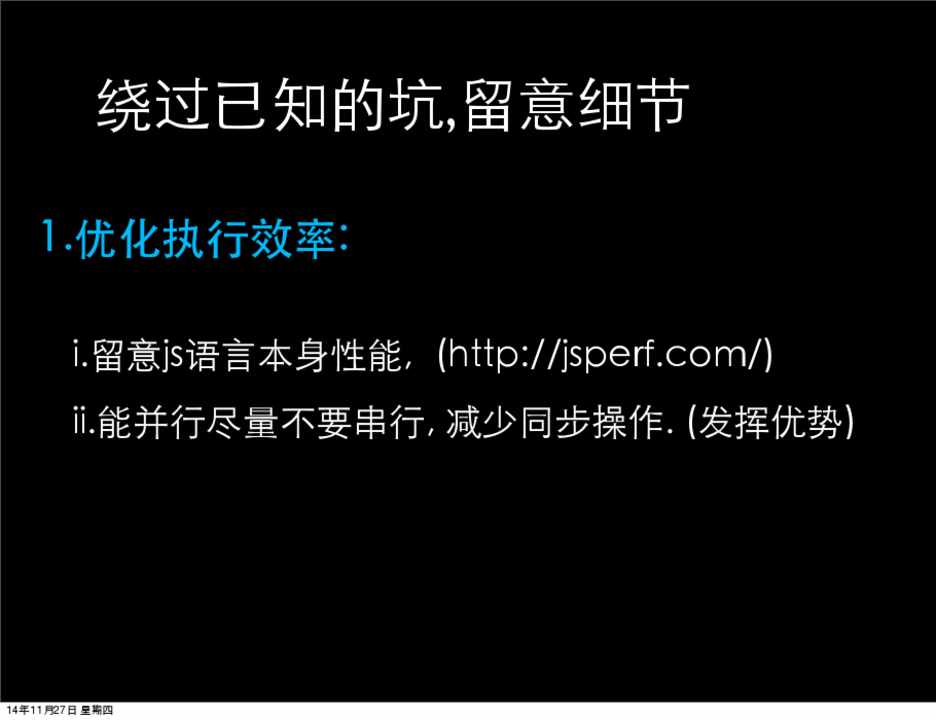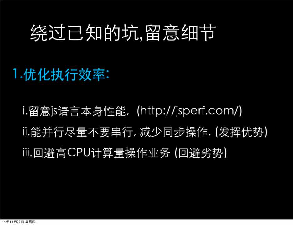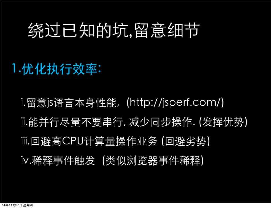 i.留意js语⾔言本⾝身性能, (http://jsperf.com/) ii.能并⾏行尽量不要串⾏行, 减少同步操作. (发挥优势) iii.回避⾼高CPU计算量操作业务 (回避劣势) iv.稀释事件触发 (类似浏览器事件稀释)