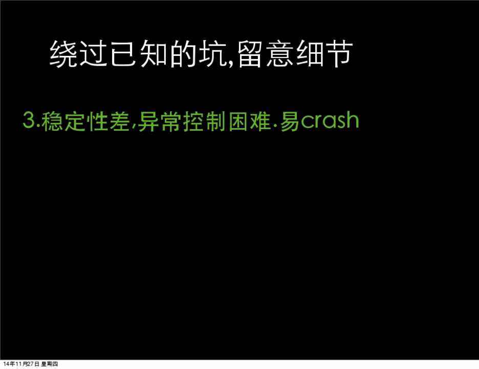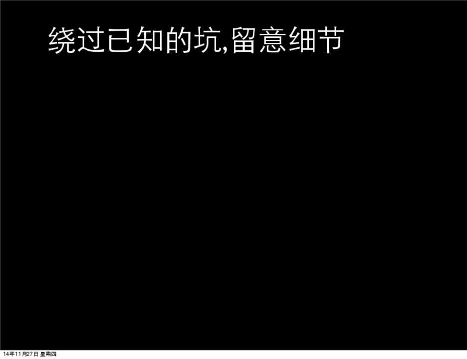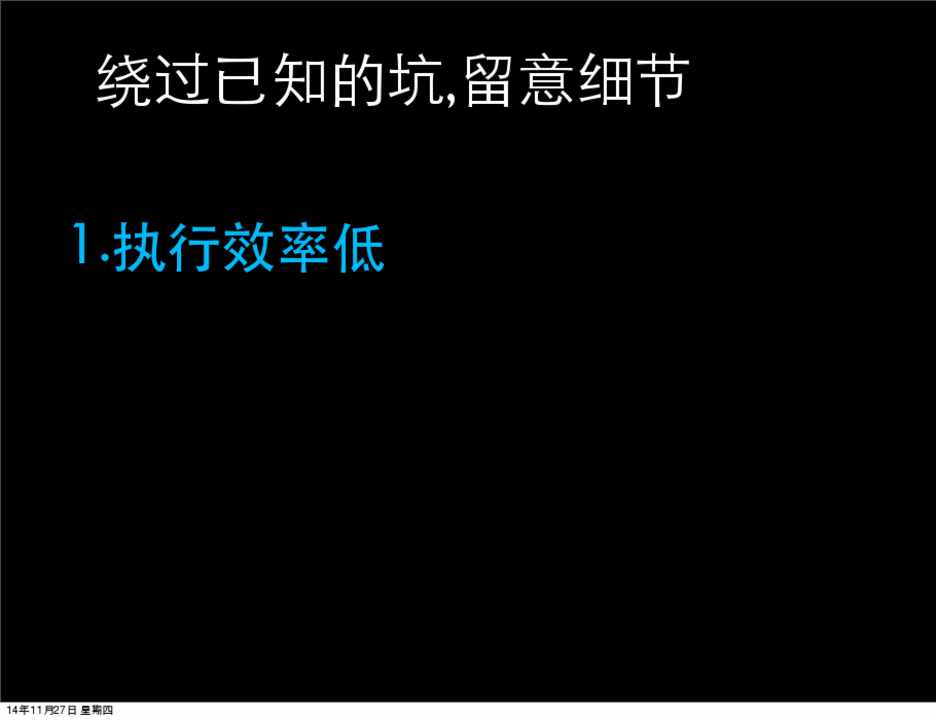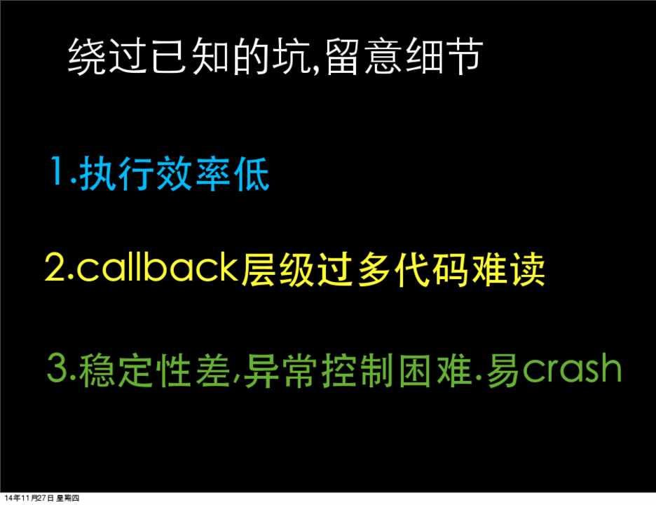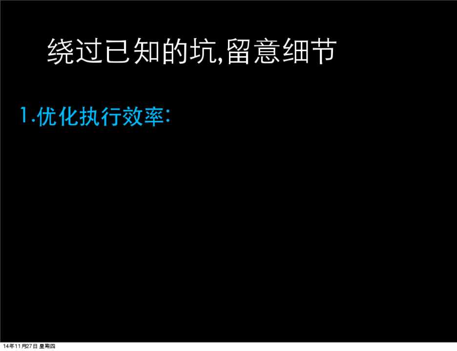 i.留意js语⾔言本⾝身性能, (http://jsperf.com/) ii.能并⾏行尽量不要串⾏行, 减少同步操作. (发挥优势) iii.回避⾼高CPU计算量操作业务 (回避劣势) iv.稀释事件触发 (类似浏览器事件稀释)