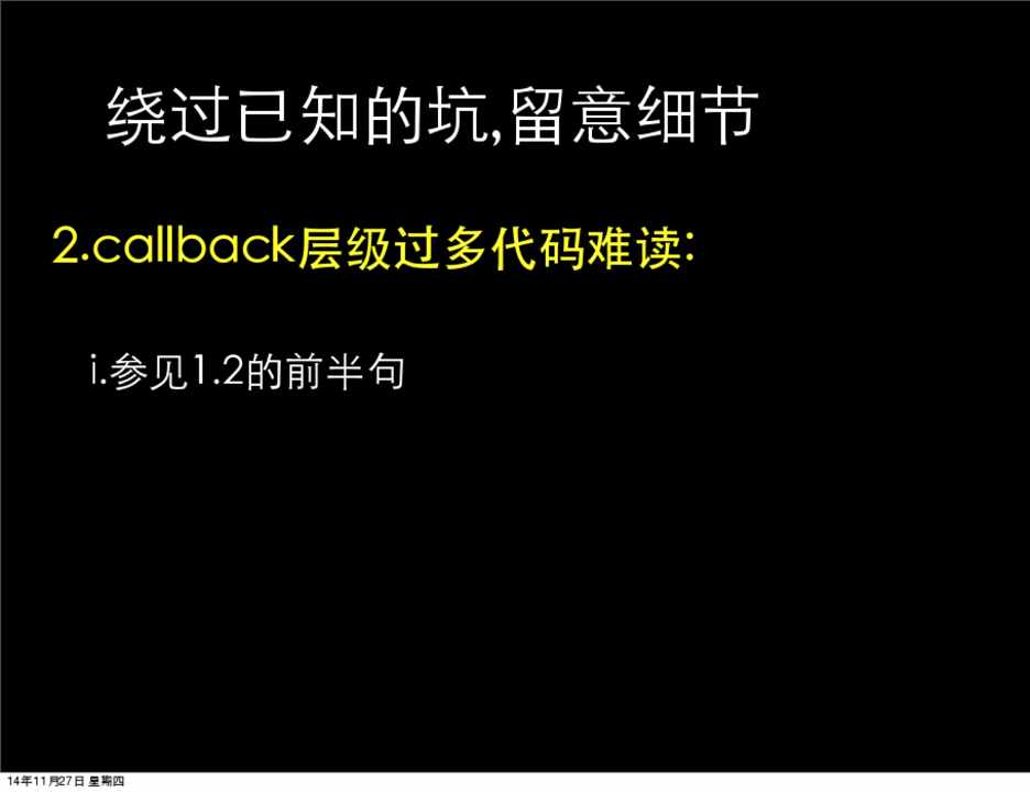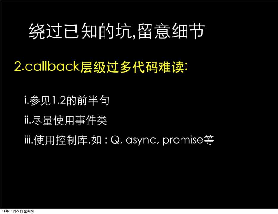i.参⻅见1.2的前半句 ii.尽量使⽤用事件类 iii.使⽤用控制库,如 : Q, async, promise等