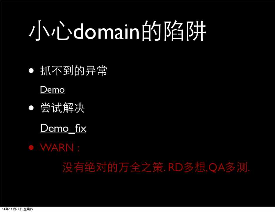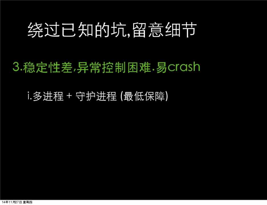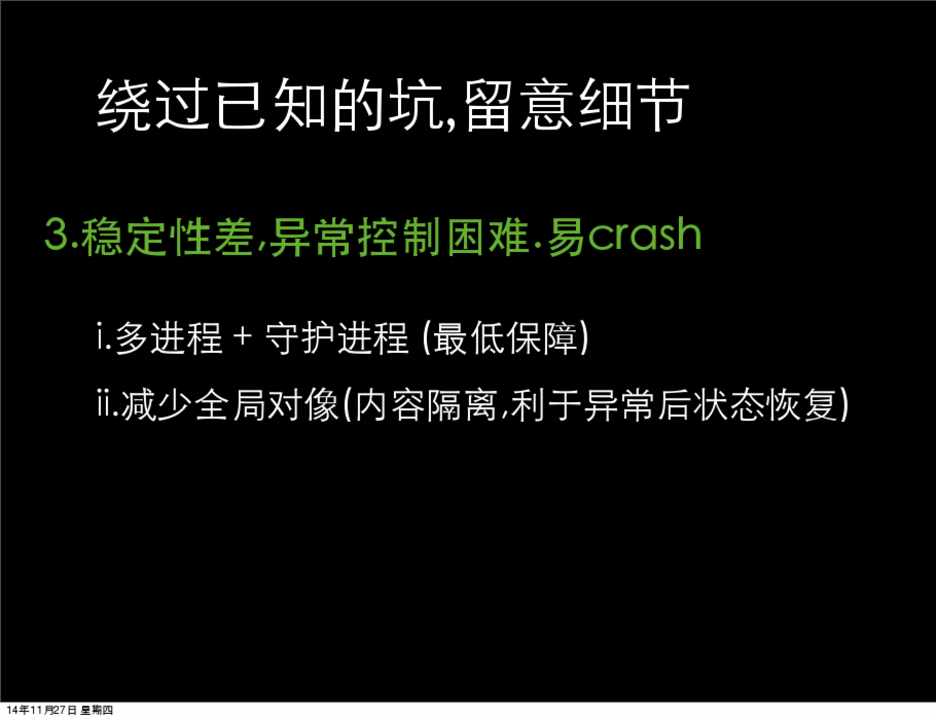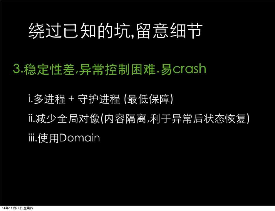 i.多进程 + 守护进程 (最低保障) ii.减少全局对像(内容隔离,利于异常后状态恢复) iii.使⽤用Domain