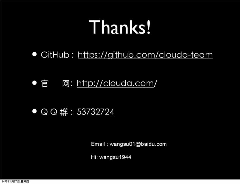 • GitHub : https://github.com/clouda-team • 官 ⺴⽹网: http://clouda.com/ • Q Q 群 : 53732724