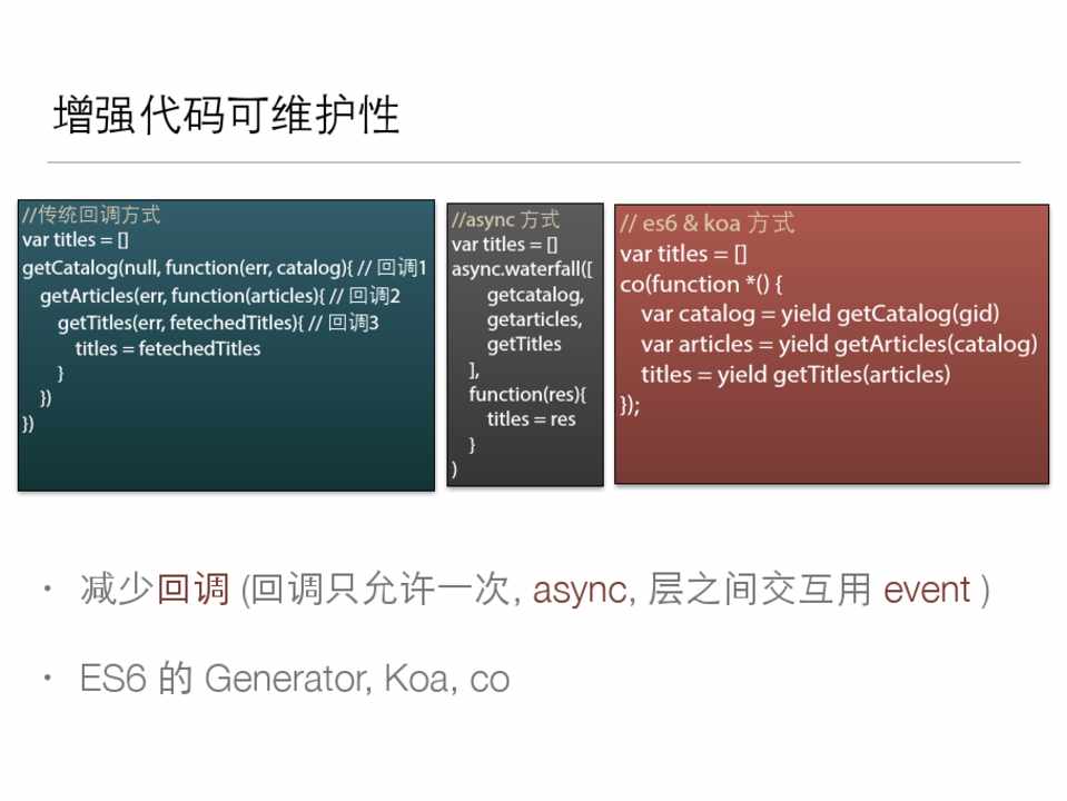 • 减少回调 (回调只允许⼀一次, async, 层之间交互⽤用 event ) • ES6 的 Generator, Koa, co