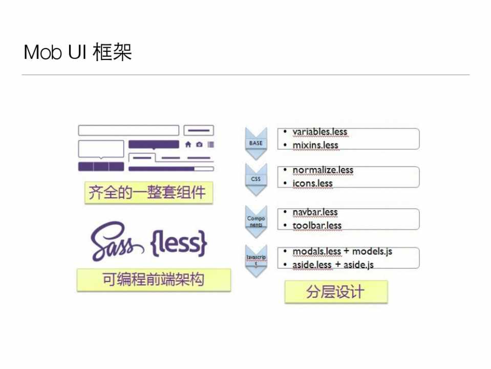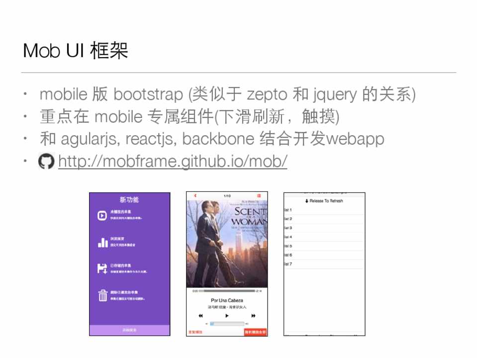 • mobile 版 bootstrap (类似于 zepto 和 jquery 的关系) • 重点在 mobile 专属组件(下滑刷新,触摸) • 和 agularjs, reactjs, backbone 结合开发webapp • http://mobframe.github.io/mob/