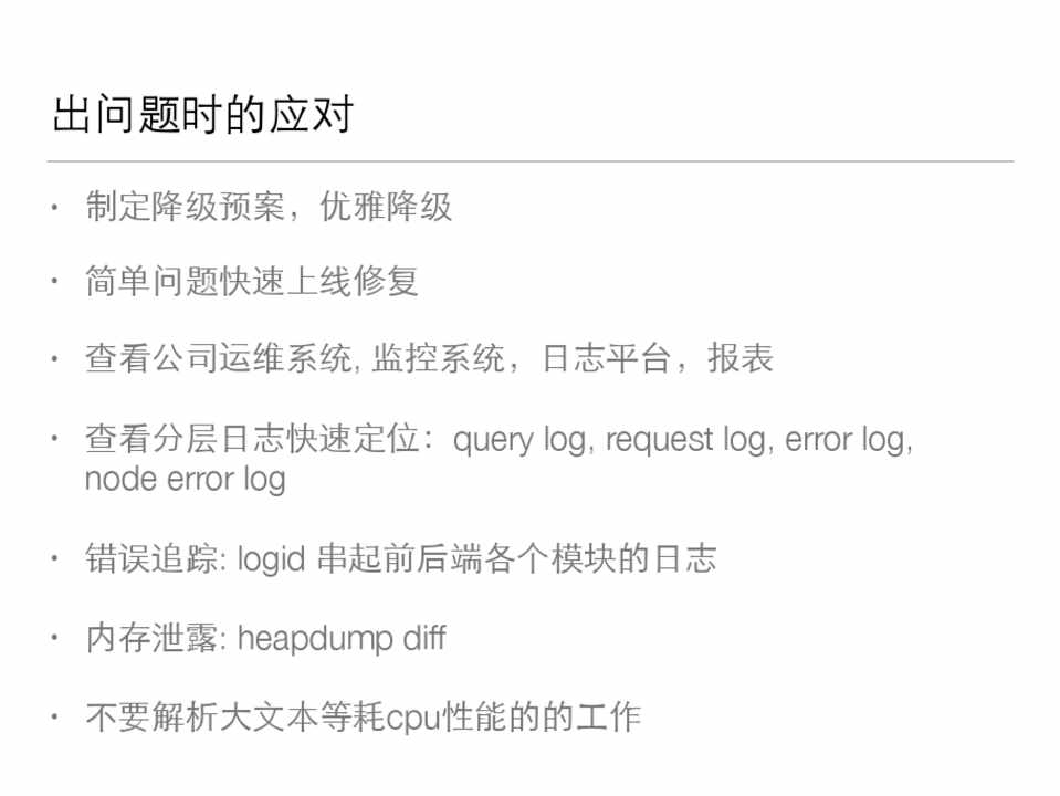 node error log • 错误追踪: logid 串起前后端各个模块的⽇日志 • 内存泄露: heapdump diff • 不要解析⼤大⽂文本等耗cpu性能的的⼯工作