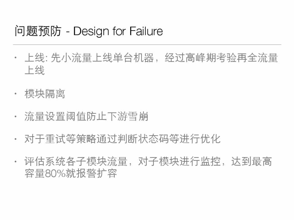 • 评估系统各⼦子模块流量,对⼦子模块进⾏行监控,达到最⾼高 容量80%就报警扩容