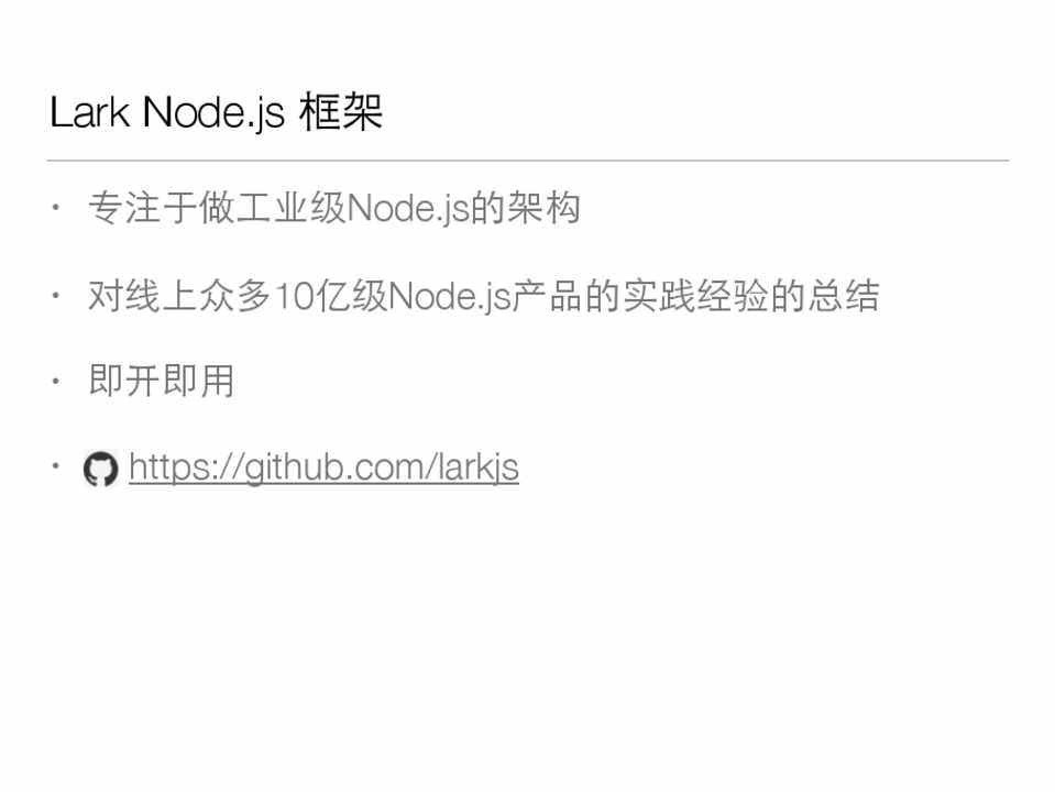 • 专注于做⼯工业级Node.js的架构 • 对线上众多10亿级Node.js产品的实践经验的总结 • 即开即⽤用 • https://github.com/larkjs