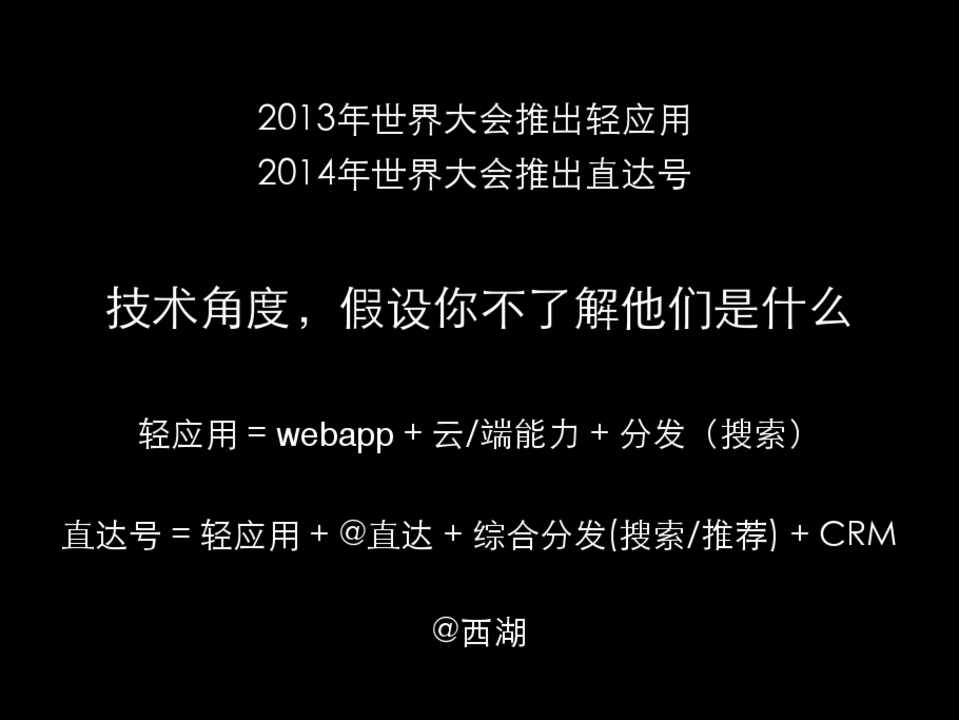 轻应⽤用 = webapp + 云/端能⼒力 + 分发(搜索) 直达号 = 轻应⽤用 + @直达 + 综合分发(搜索/推荐) + CRM