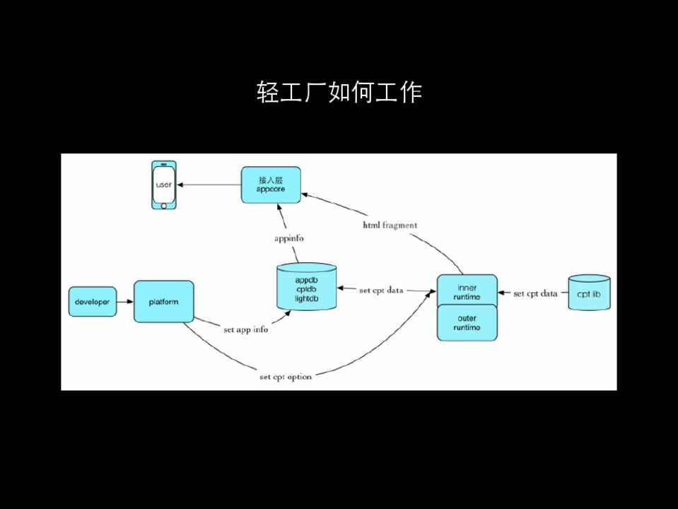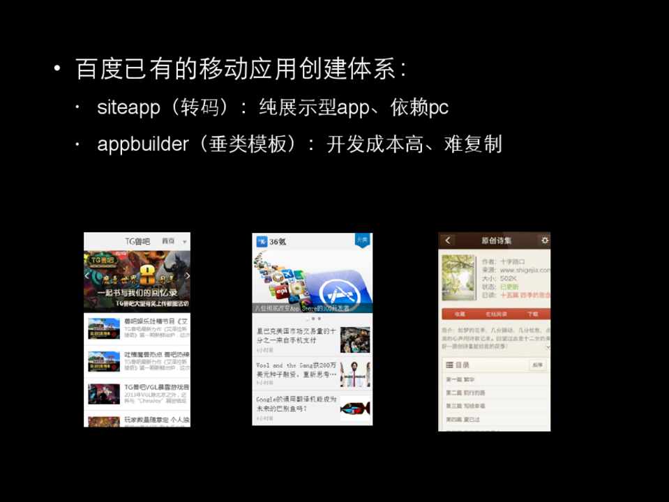 • siteapp(转码):纯展⽰示型app、依赖pc • appbuilder(垂类模板):开发成本⾼高、难复制