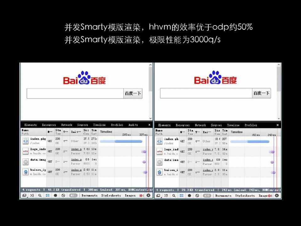 并发Smarty模版渲染,hhvm的效率优于odp约50% 并发Smarty模版渲染,极限性能为3000q/s