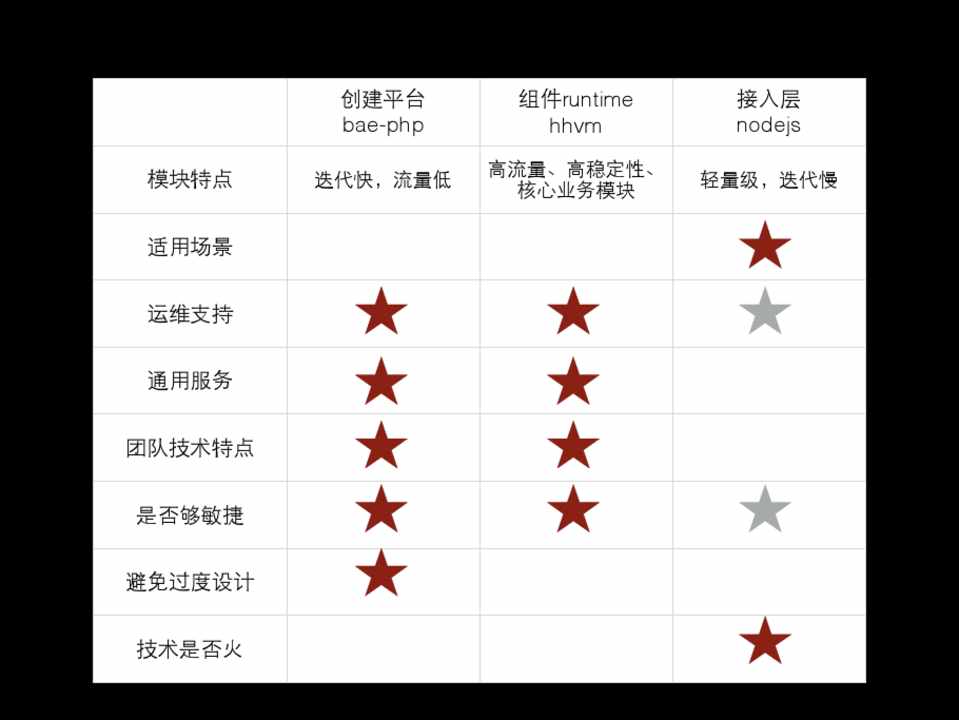 模块特点 适⽤用场景 运维⽀支持 通⽤用服务 团队技术特点 是否够敏捷 避免过度设计 技术是否⽕火