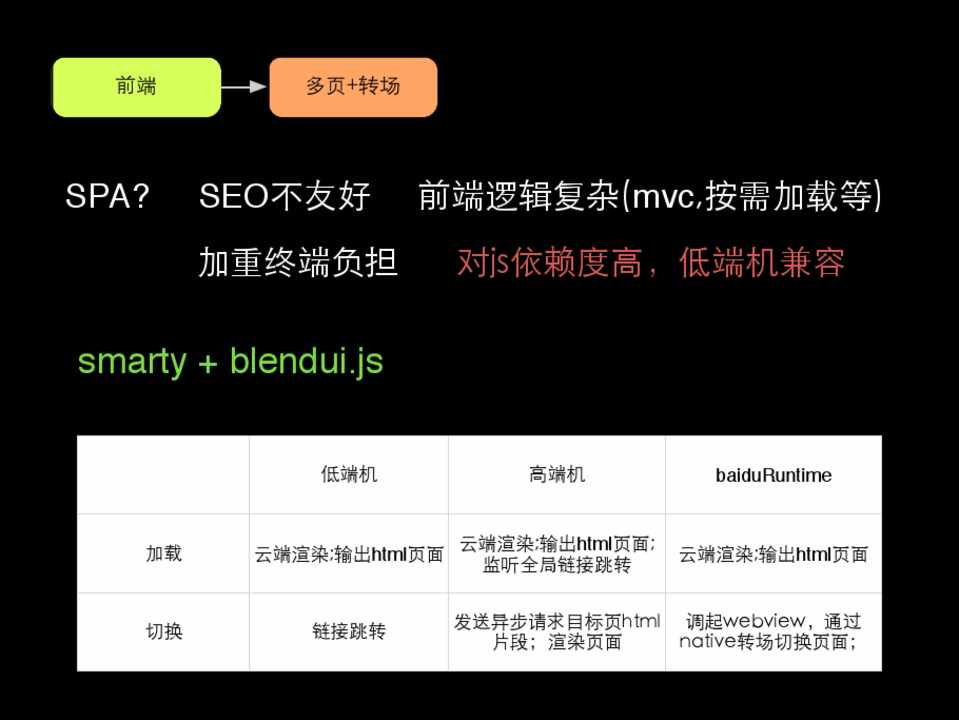 SPA? SEO不友好 前端逻辑复杂(mvc,按需加载等) 加重终端负担 对js依赖度⾼高,低端机兼容