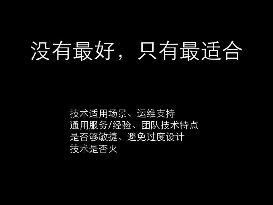 技术适⽤用场景、运维⽀支持 通⽤用服务/经验、团队技术特点 是否够敏捷、避免过度设计 技术是否⽕火