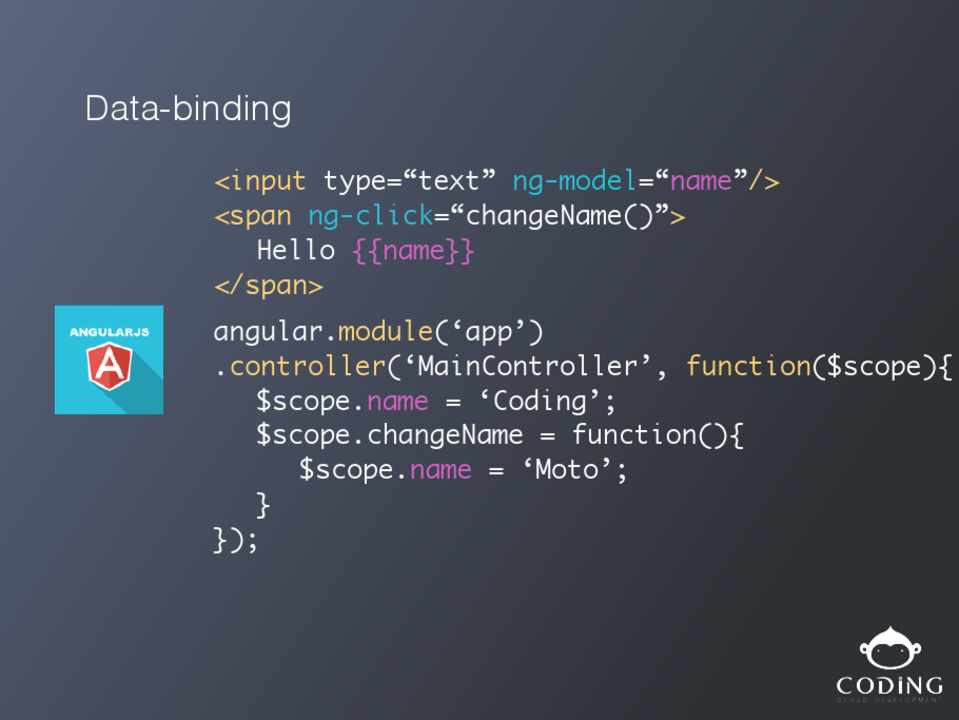 $scope.name = ‘Coding’; $scope.changeName = function(){