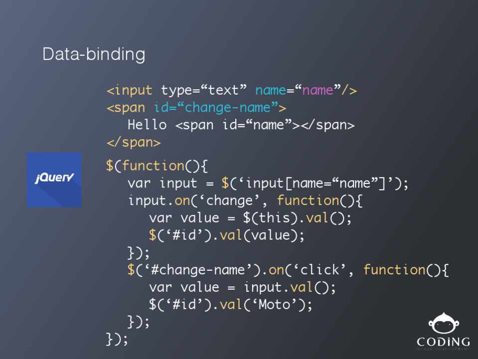 $(function(){ var input = $(‘input[name=“name”]’); input.on(‘change’, function(){ var value = $(this).val(); $(‘#id’).val(value); }); $(‘#change-name’).on(‘click’, function(){ var value = input.val(); $(‘#id’).val(‘Moto’); });