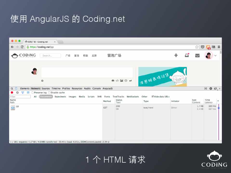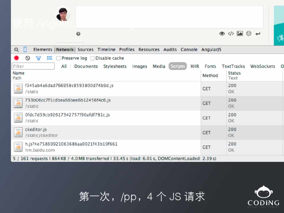 使⽤用 AngularJS 的 Coding.net 第⼀一次,/pp,4 个 JS 请求