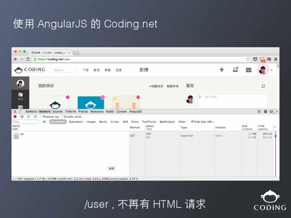 使⽤用 AngularJS 的 Coding.net /user , 不再有 HTML 请求
