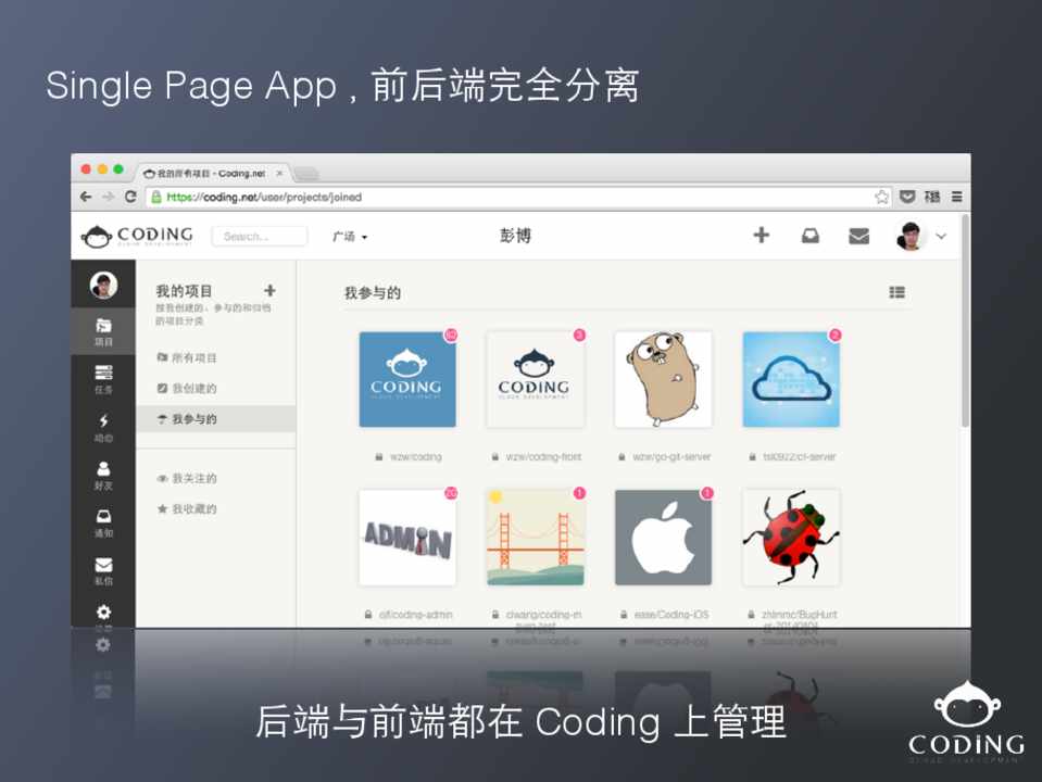 Single Page App , 前后端完全分离 后端与前端都在 Coding 上管理