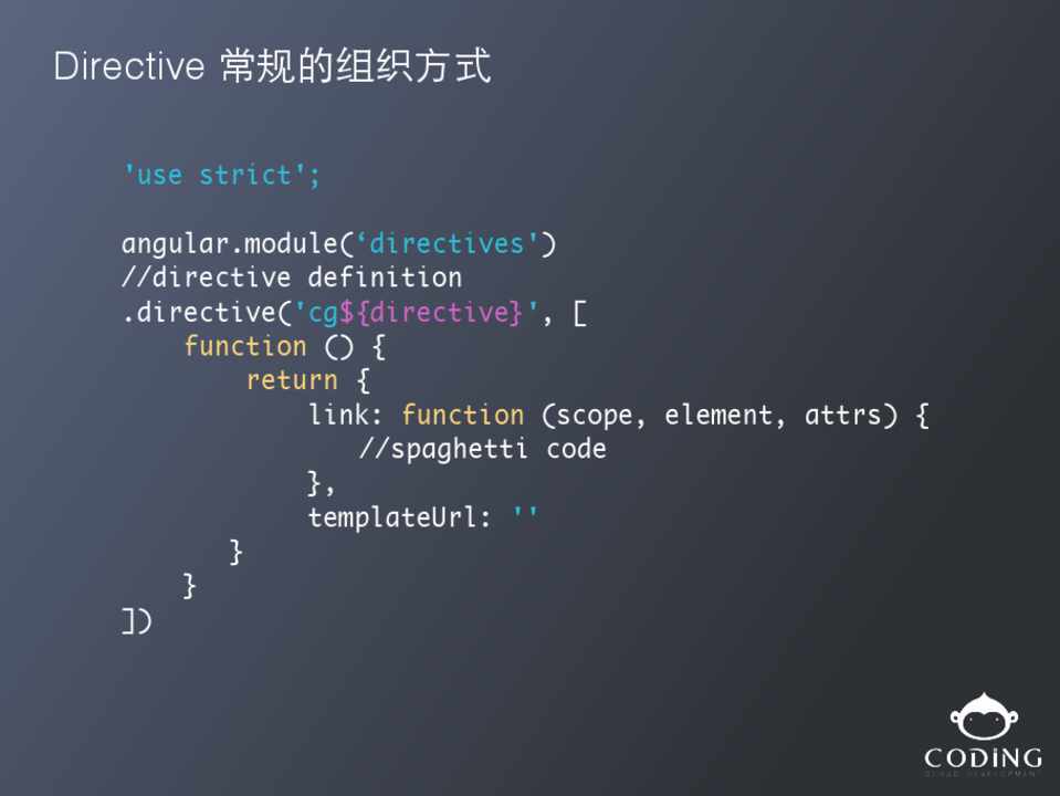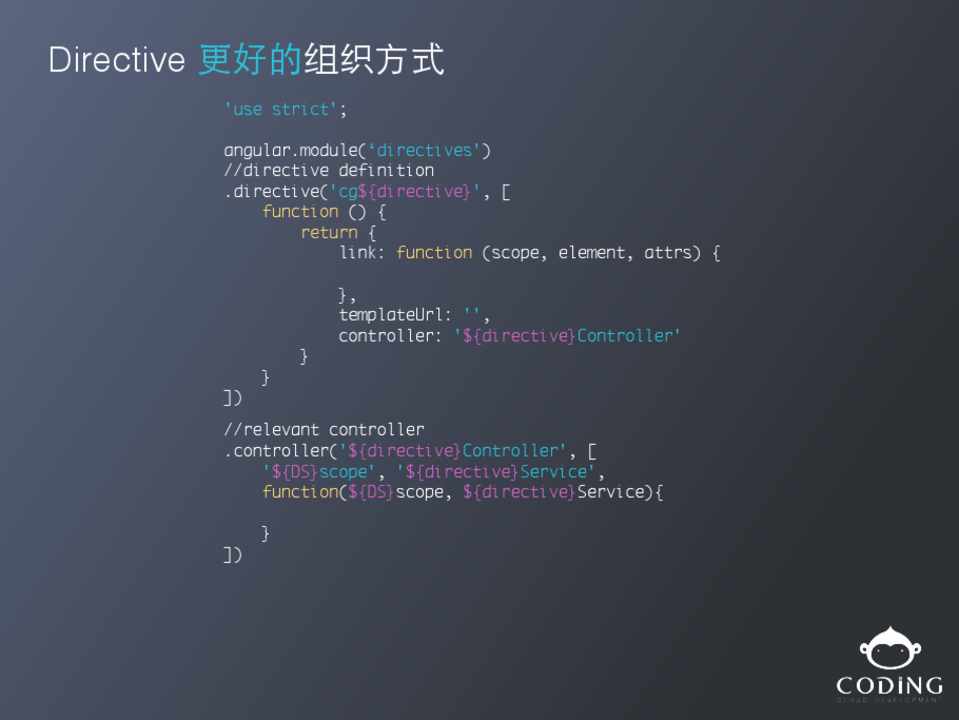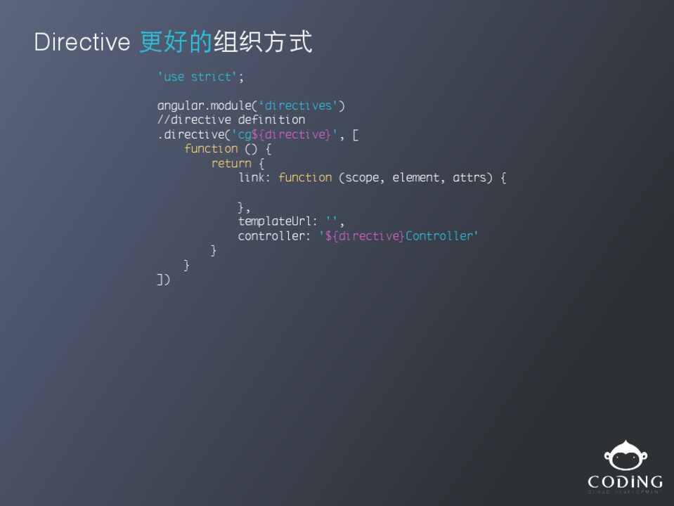 angular.module(‘directives') //directive definition .directive('cg${directive}', [