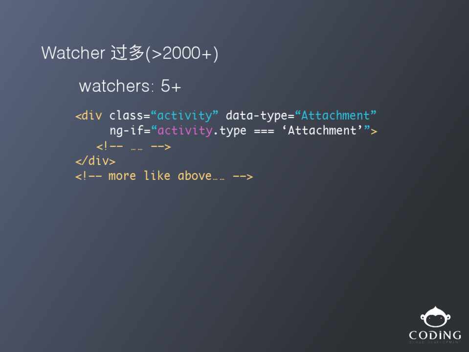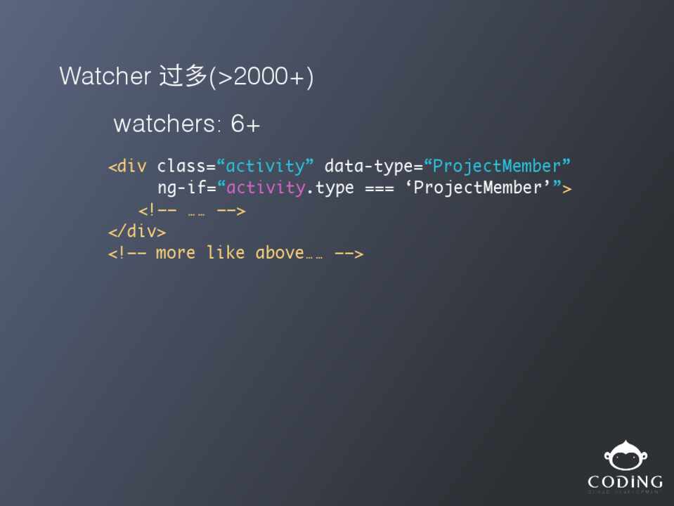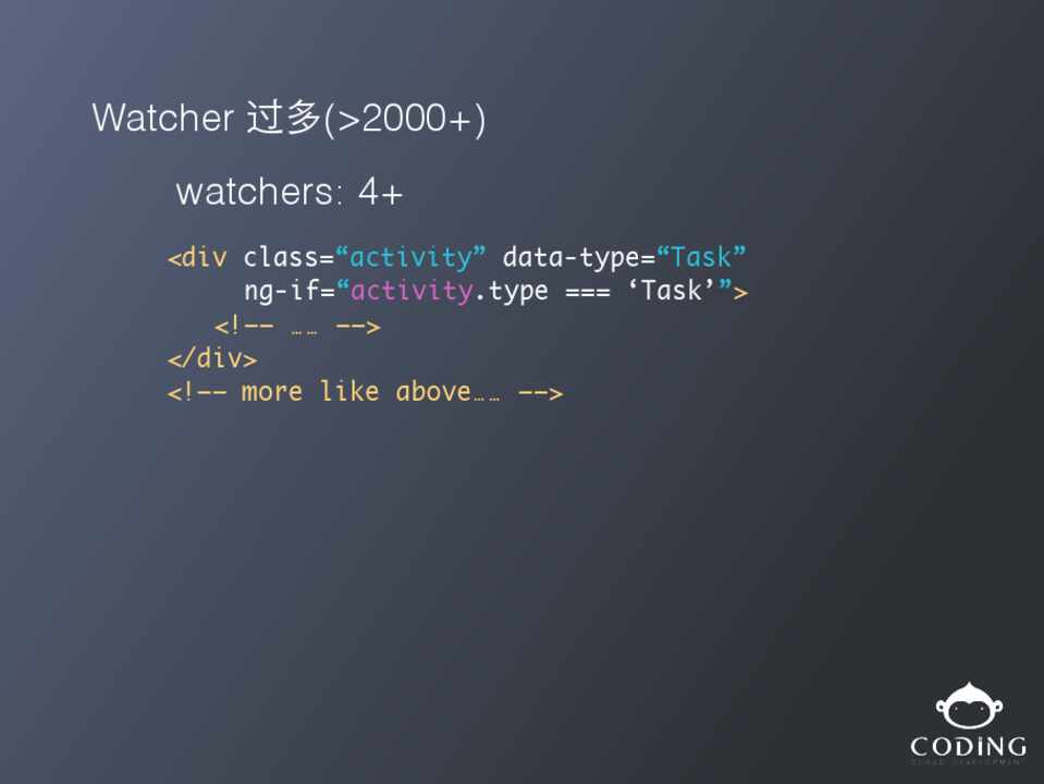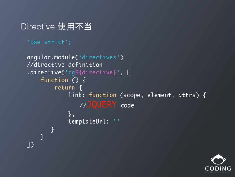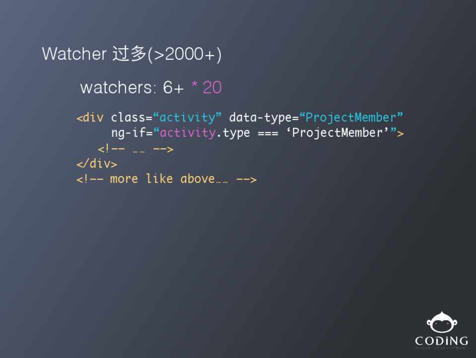 1. jQuery 到 AngularJS 的思维转换 2. Directive 使⽤用不当 3. View 和 Controller 过于复杂 4. Watcher 过多(>2000+)