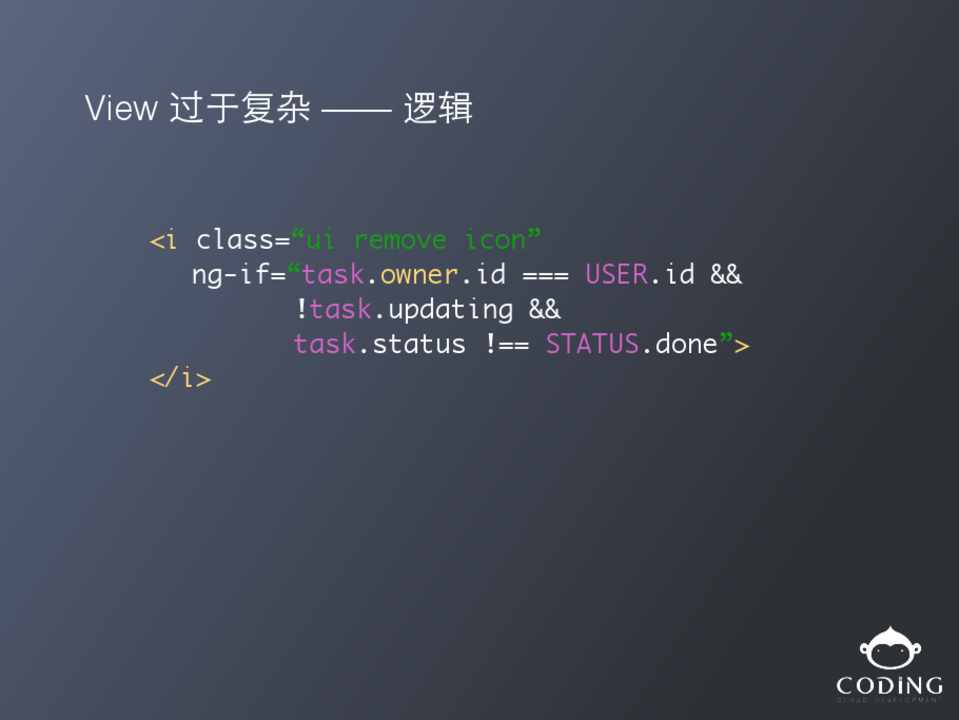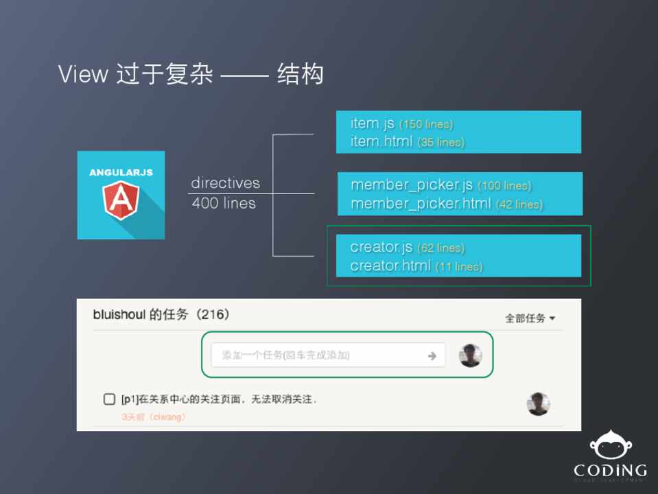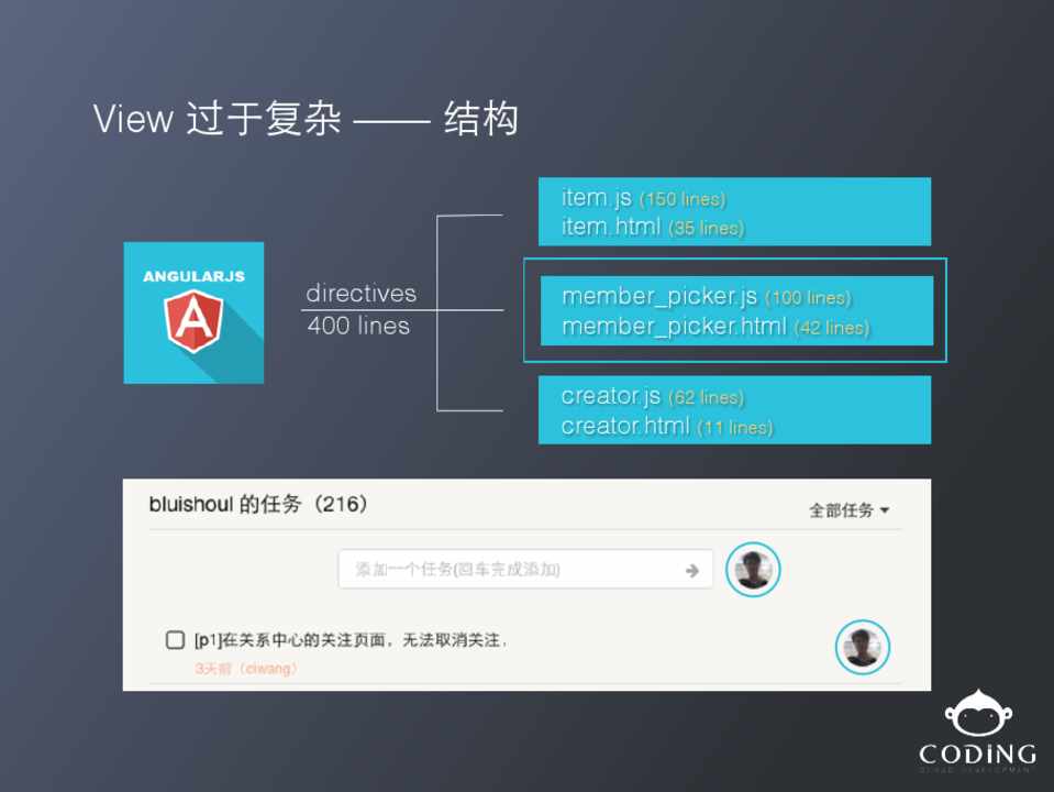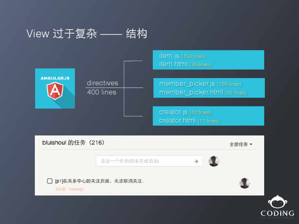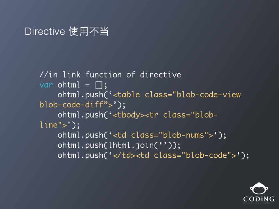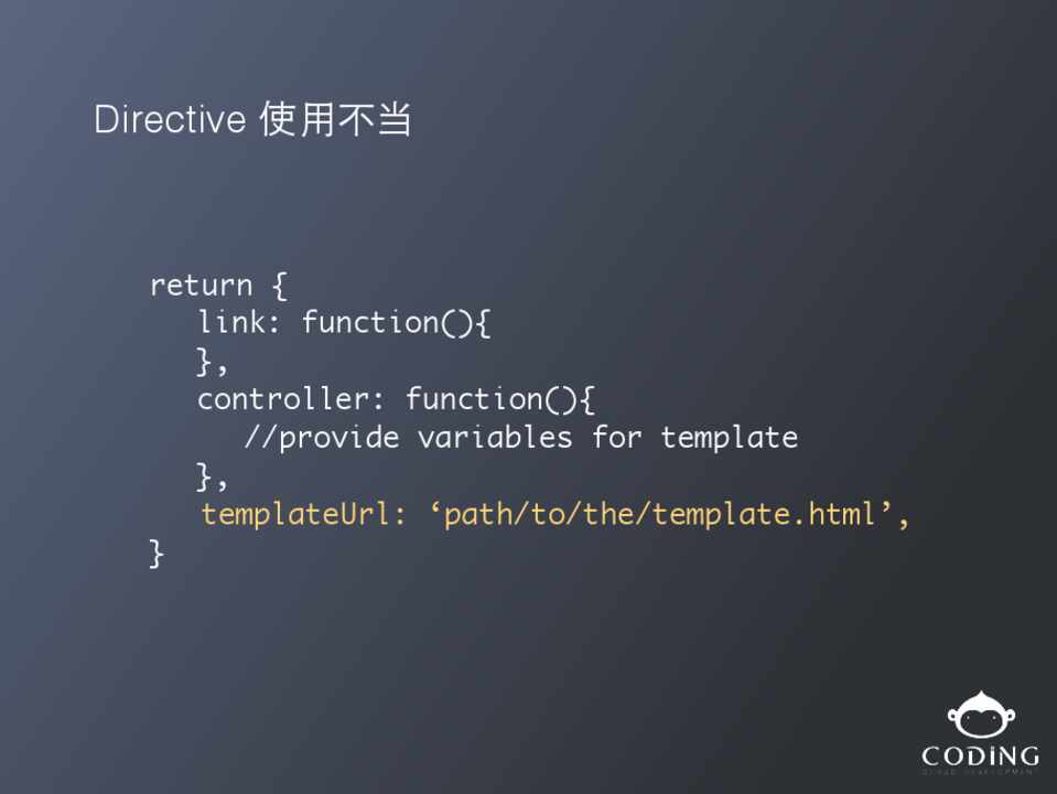 1. jQuery 到 AngularJS 的思维转换 2. Directive 使⽤用不当 3. View 和 Controller 过于复杂 4. Watcher 过多(>2000+)