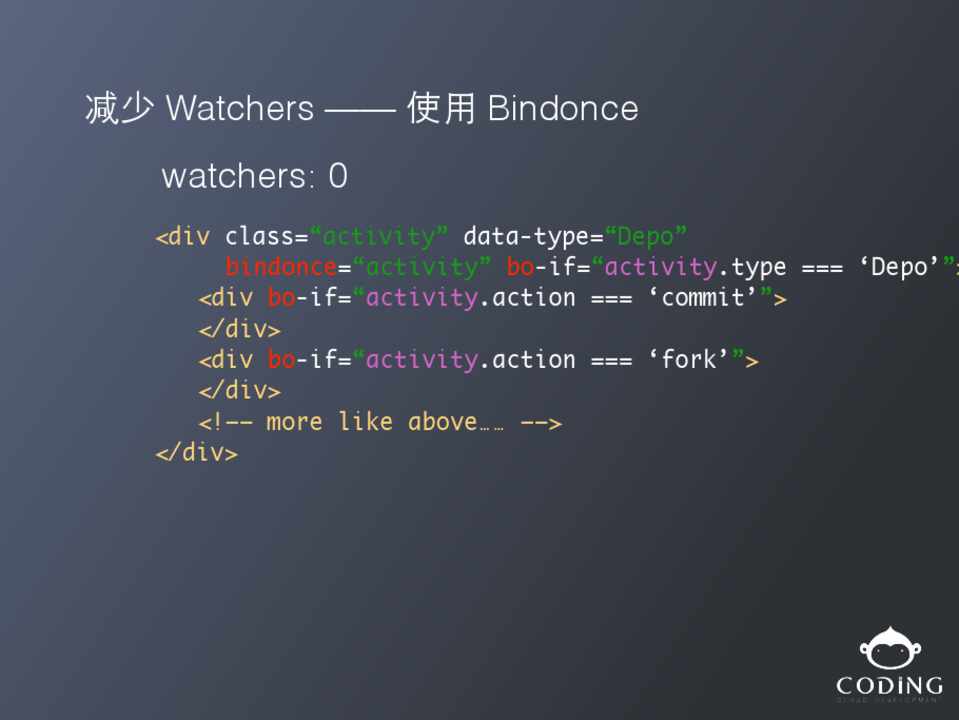 <div bo-if=“activity.action === ‘commit’”> </div> <div bo-if=“activity.action === ‘fork’”> </div> <!—— more like above…… ——> </div>