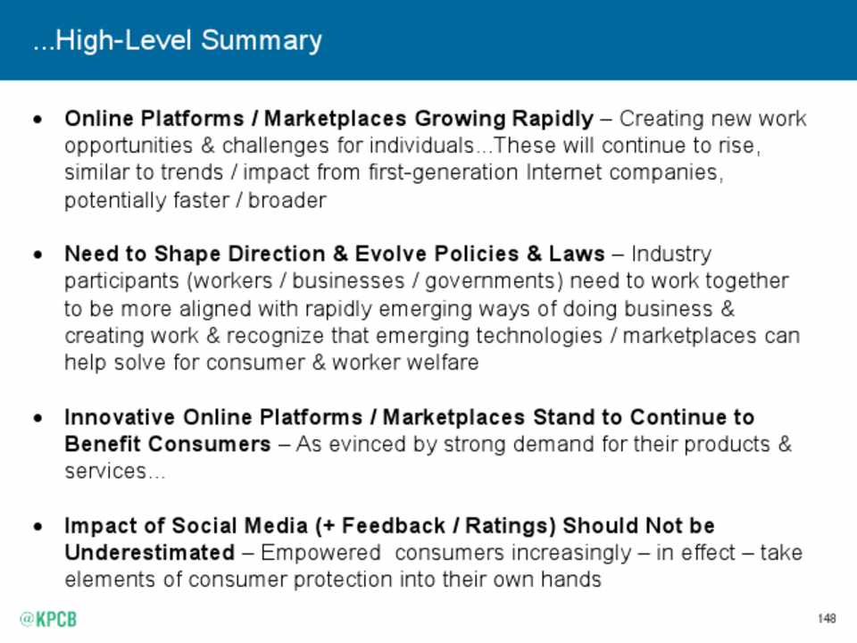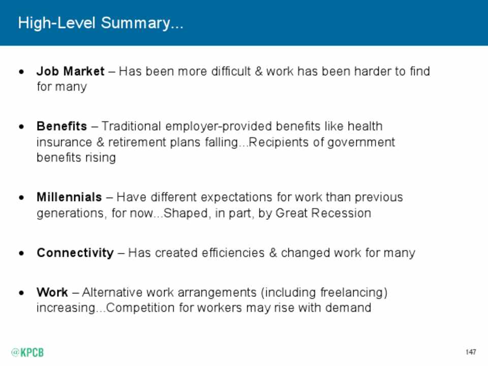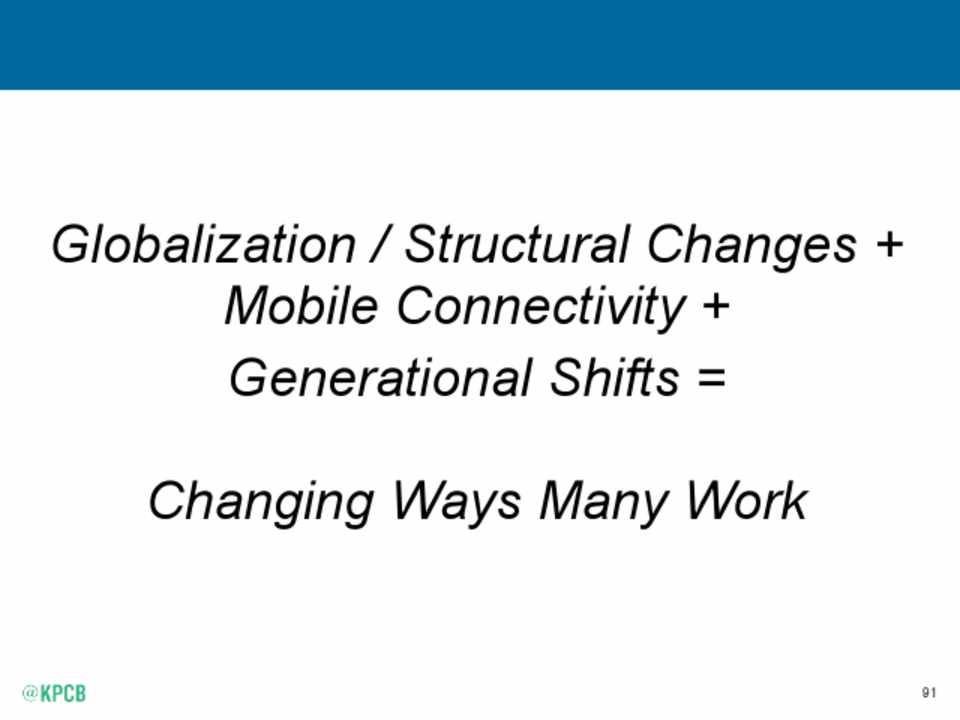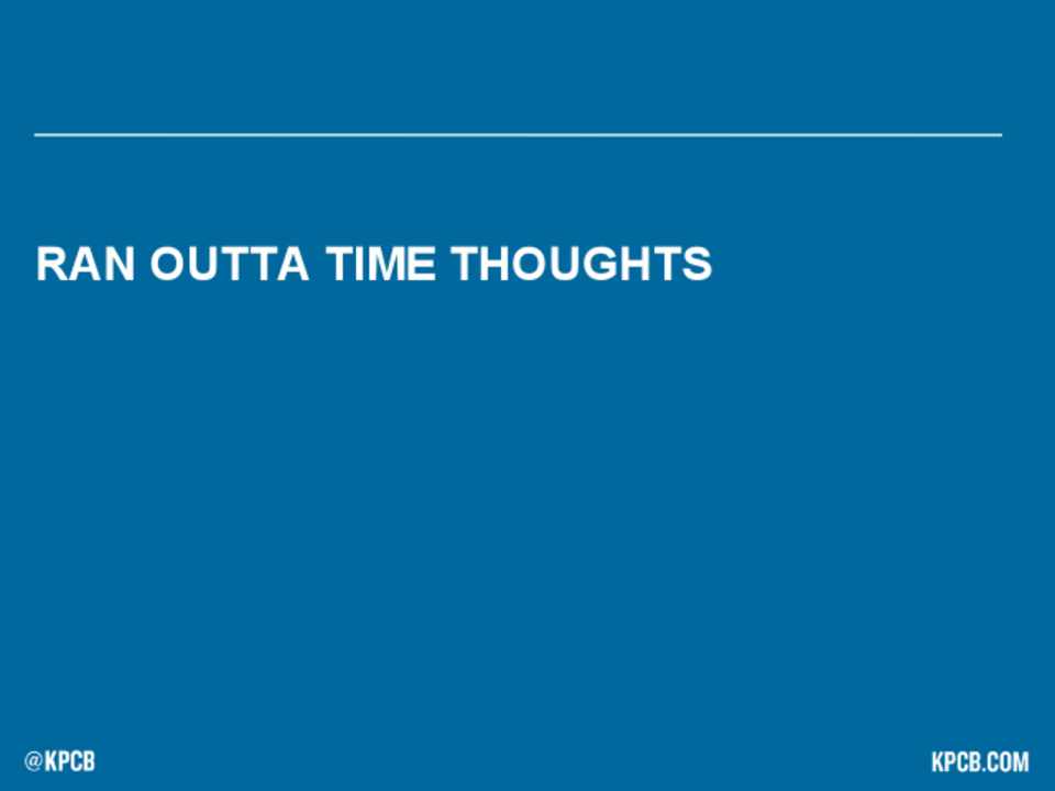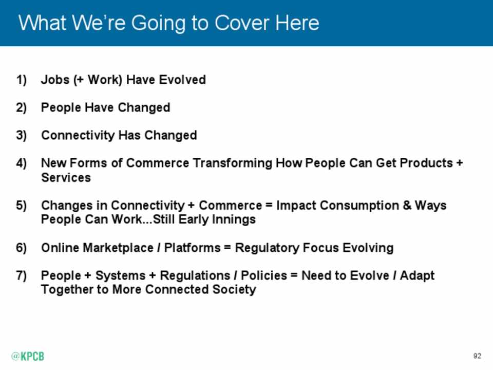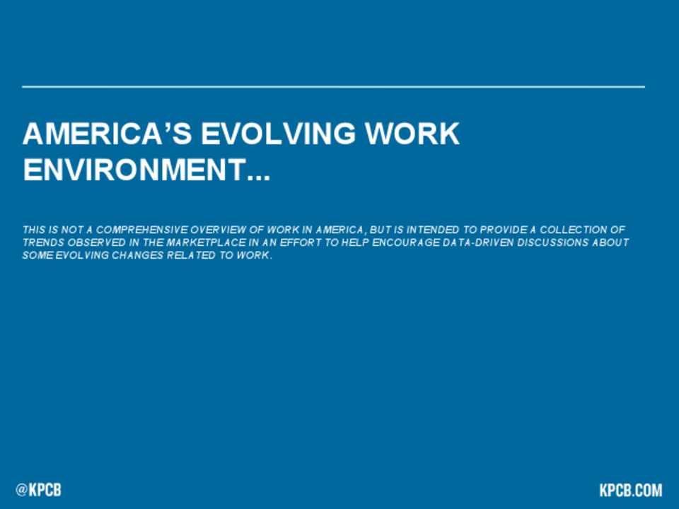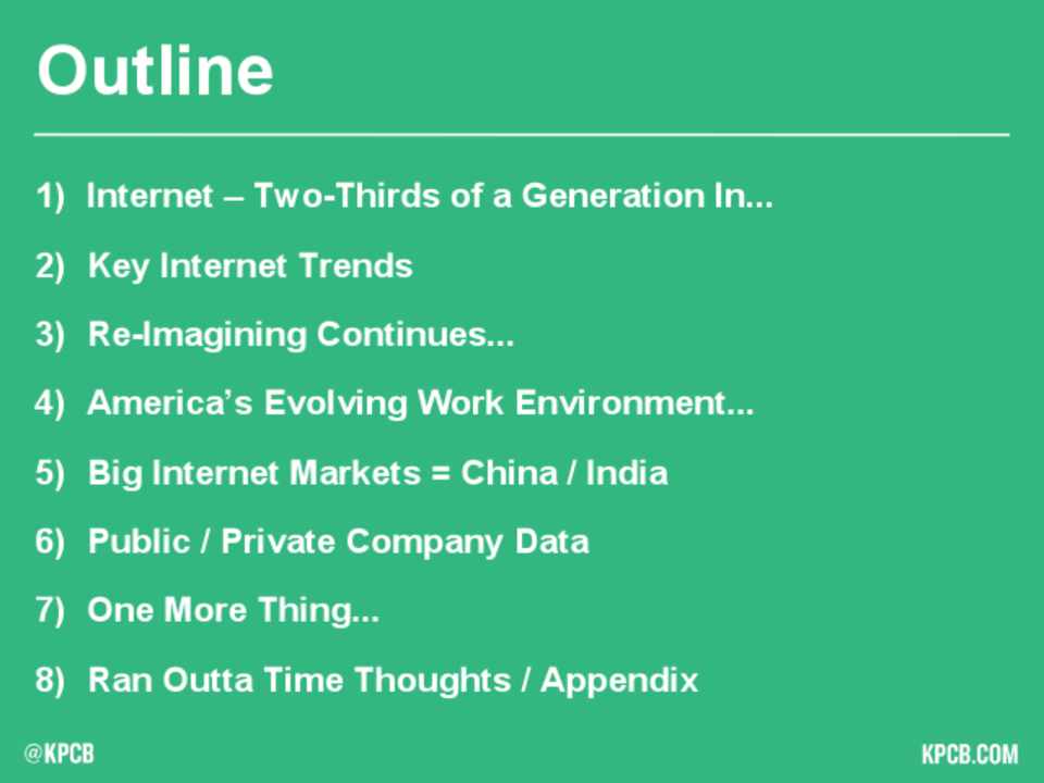 1) Internet – Two-Thirds of a Generation In... 2) Key Internet Trends 3) Re-Imagining Continues... 4) America’s Evolving Work Environment... 5) Big Internet Markets = China / India 6) Public / Private Company Data 7) One More Thing... 8) Ran Outta Time Thoughts / Appendix