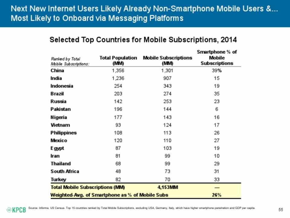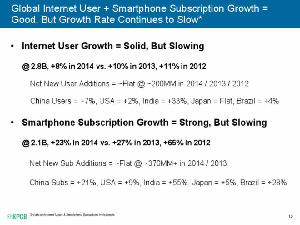@ 2.1B, +23% in 2014 vs. +27% in 2013, +65% in 2012 Net New Sub Additions = ~Flat @ ~370MM+ in 2014 / 2013 China Subs = +21%, USA = +9%, India = +55%, Japan = +5%, Brazil = +28%