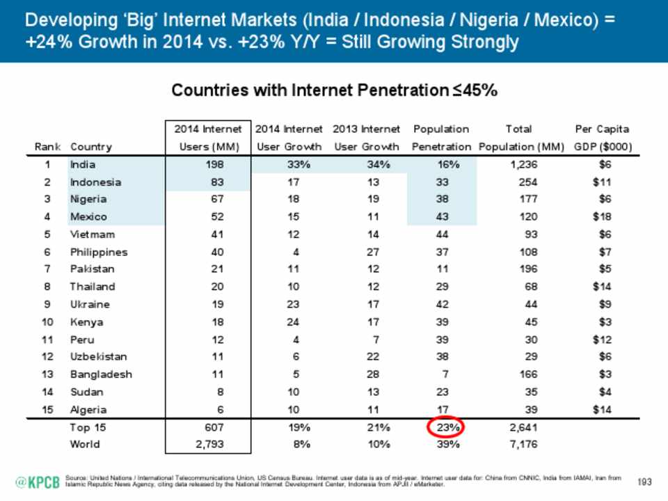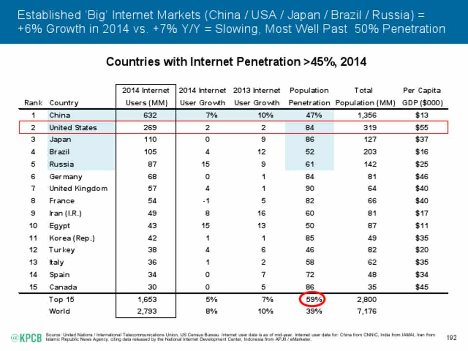 @ 2.8B, +8% in 2014 vs. +10% in 2013, +11% in 2012 Net New User Additions = ~Flat @ ~200MM in 2014 / 2013 / 2012 China Users = +7%, USA = +2%, India = +33%, Japan = Flat, Brazil = +4%