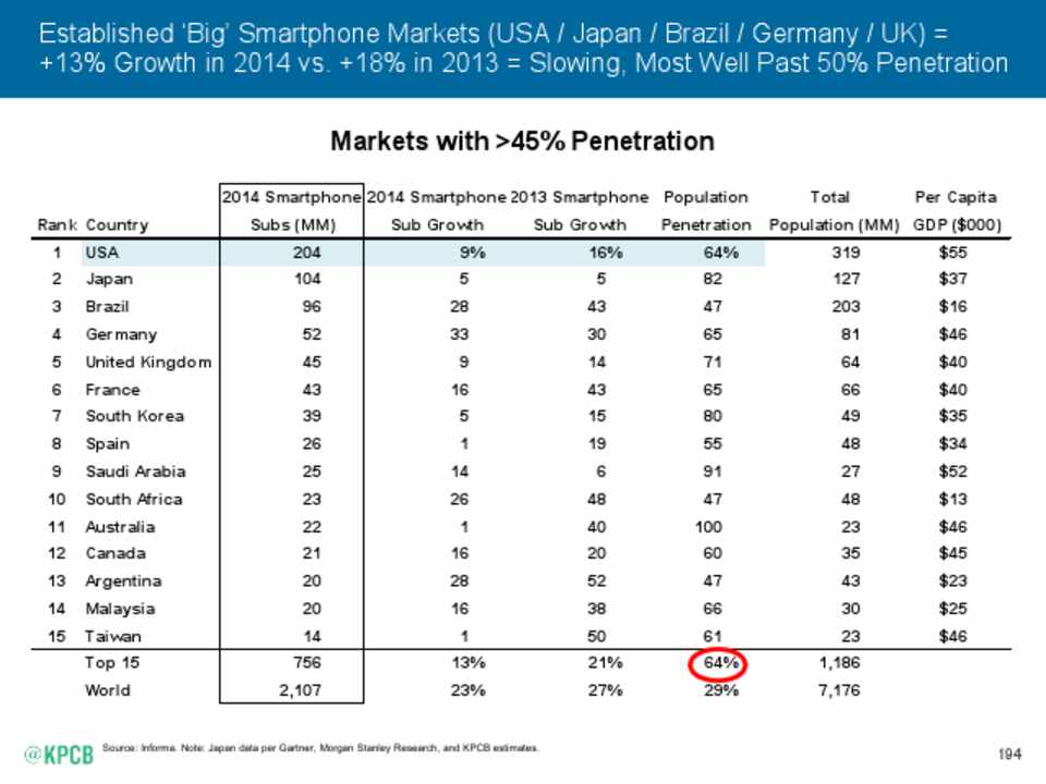 Established ‘Big’ Smartphone Markets (USA / Japan / Brazil / Germany / UK) = +13% Growth in 2014 vs. +18% in 2013 = Slowing, Most Well Past 50% Penetration