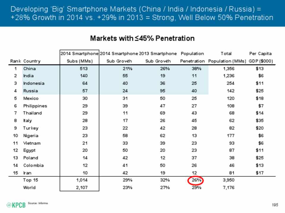 Developing ‘Big’ Smartphone Markets (China / India / Indonesia / Russia) = +28% Growth in 2014 vs. +29% in 2013 = Strong, Well Below 50% Penetration