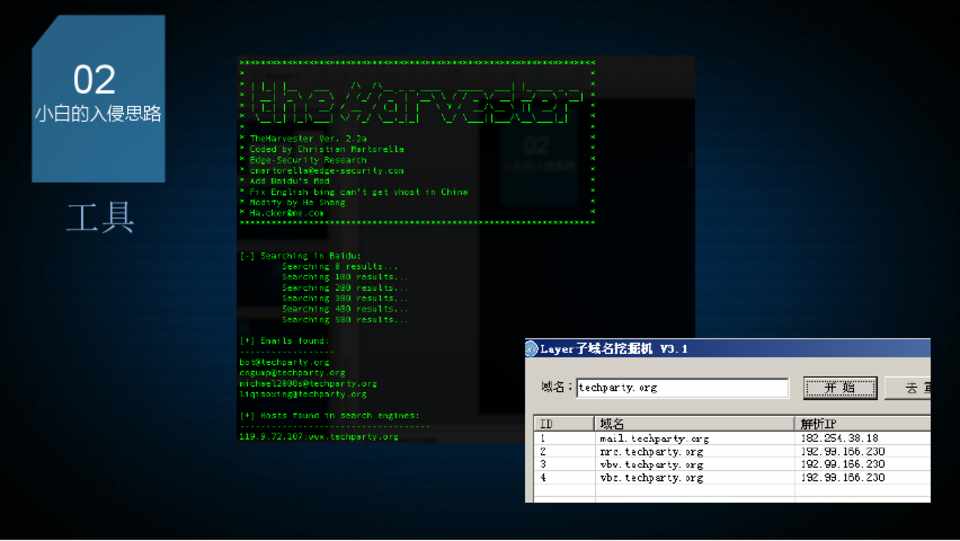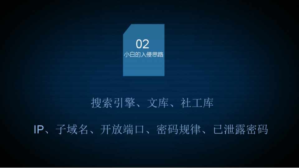 搜索引擎、文库、社工库 IP、子域名、开放端口、密码规律、已泄露密码