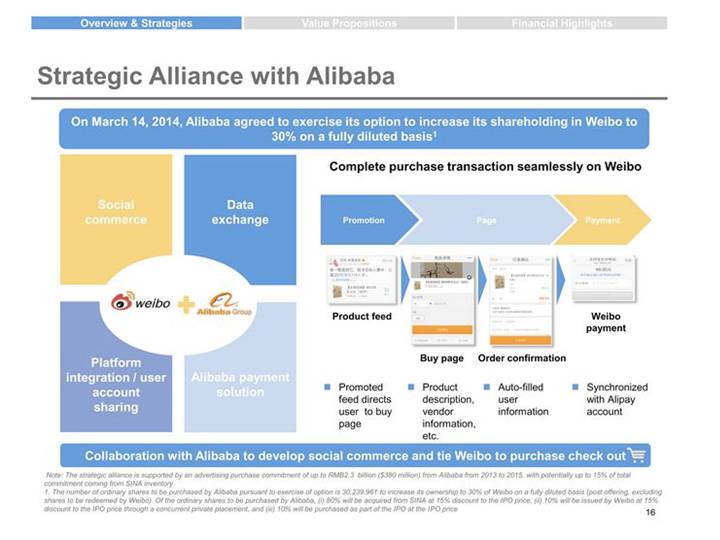 和阿里巴巴集团的战略合作,将在商业化、数据、账户互通、支付等层面达成合作,并且2014年3月14日,阿里同意行使权利,将在微博持股比例提高到30%。