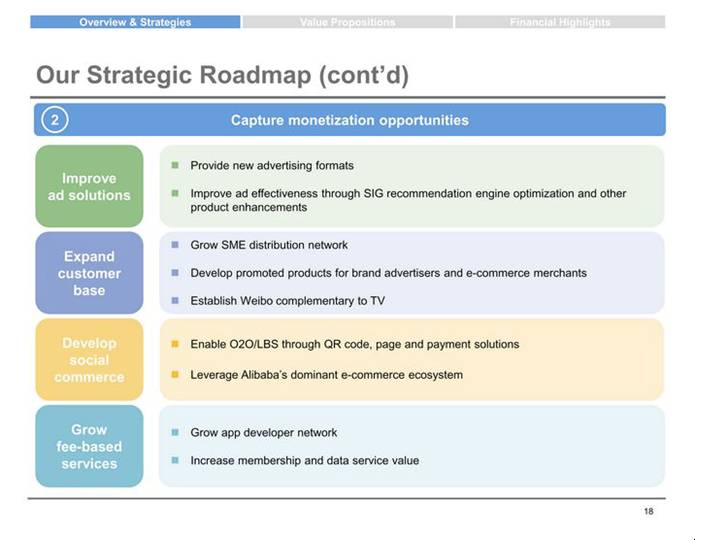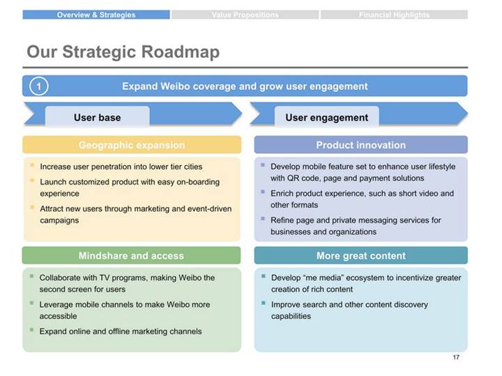 战略一:扩大微博用户覆盖面及提高用户活跃度用户拓展向三四线城市下沉;加强产品创新;和电视节目等多渠道合作;发展自媒体环境,产生更多优质内容;