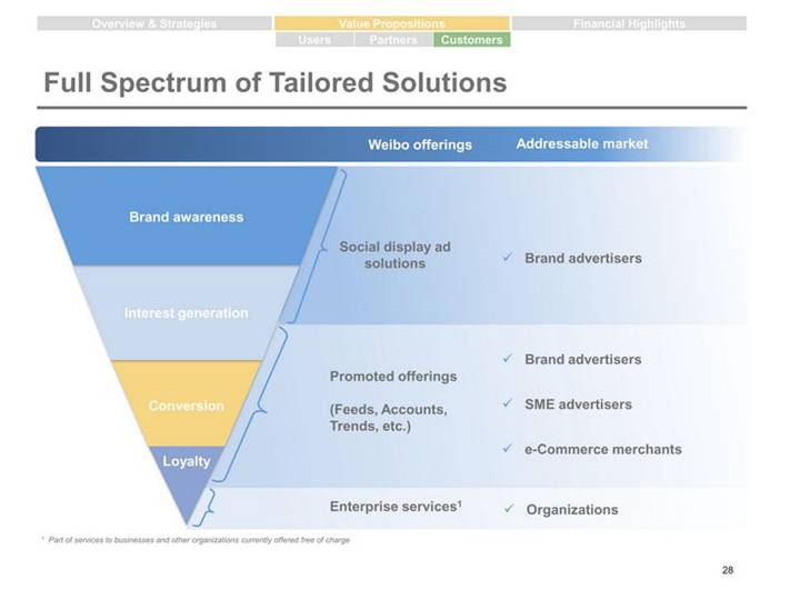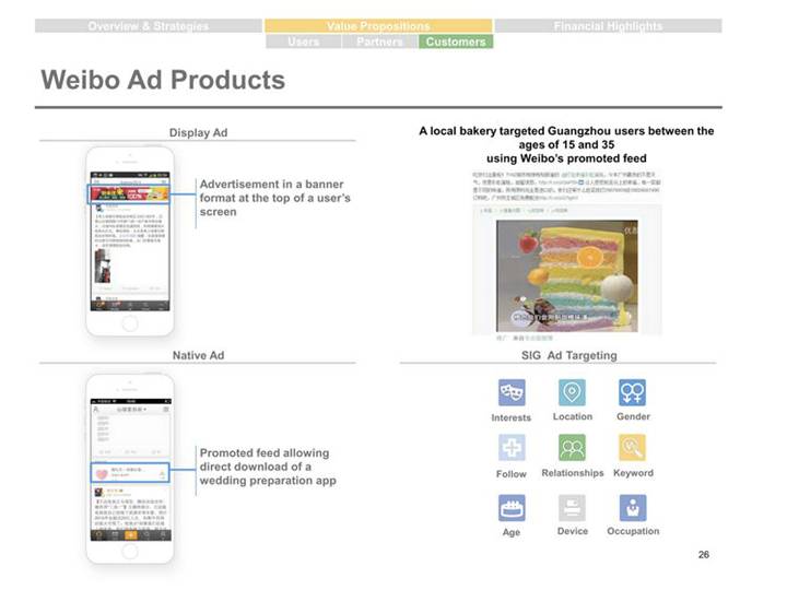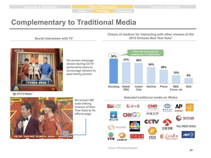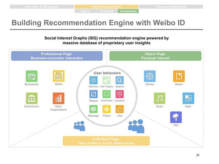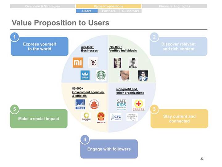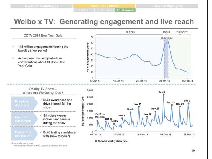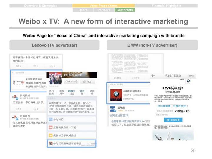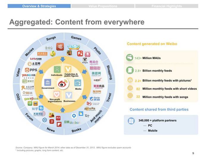 用户每月分享超过28亿条微博,34万平台合作伙伴来自媒体、社区、O2O、视频、音乐、游戏、购物、旅游等领域;