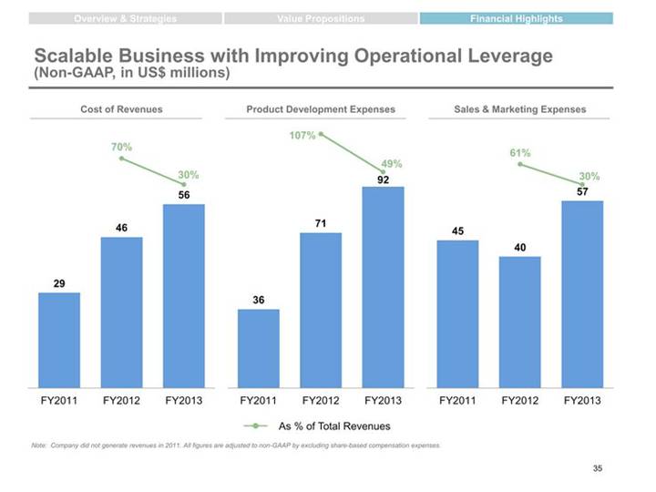 运营杠杆:2013年营收成本5600万美元,占营收比重30%,上年同期为70%;研发费用9200万美元,占比49%,上年同期为107%;销售及市场费用5700万美元,占比30%,上年同期为61%;