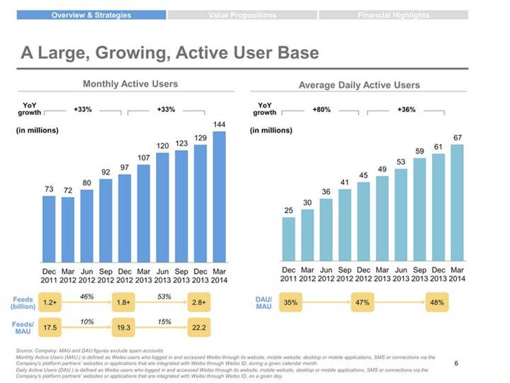 微博2014年3月MAU达1.43亿;DAU 6700万;2013年12月,用户共计分享超过28亿条微博,比2012年12月时的18亿增长53%;每活跃用户平均每月分享微博量(feeds/MAU)22条,比2012年12月时的19.3增长15%;