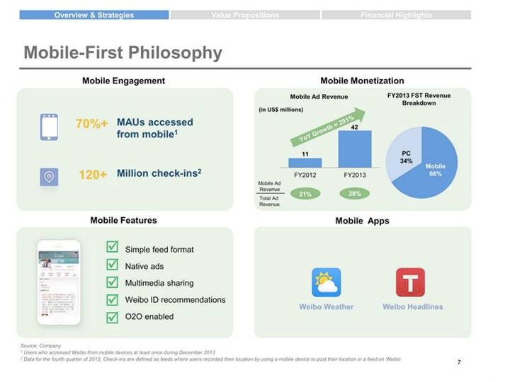 移动为先:2013年12月,微博MAUs 70%从移动端访问;2013年Q4,超过1.2亿个用户签到;2013年,来自移动端的广告收入同比增长291%至4200万美元,占总营收比重28%;