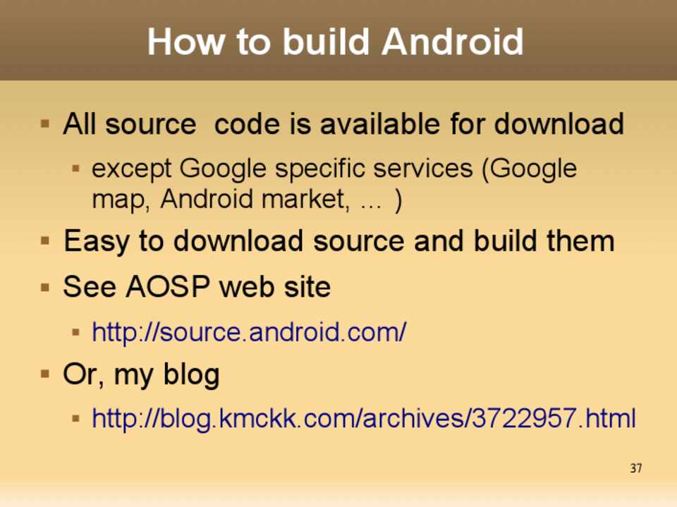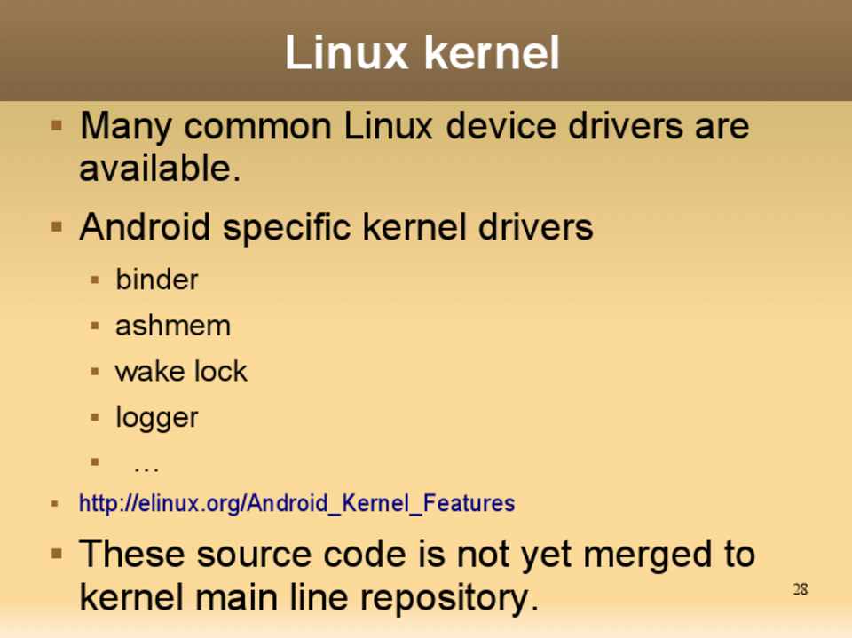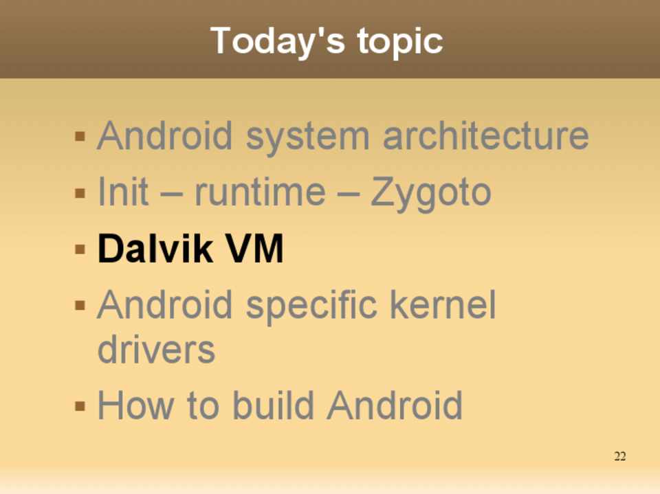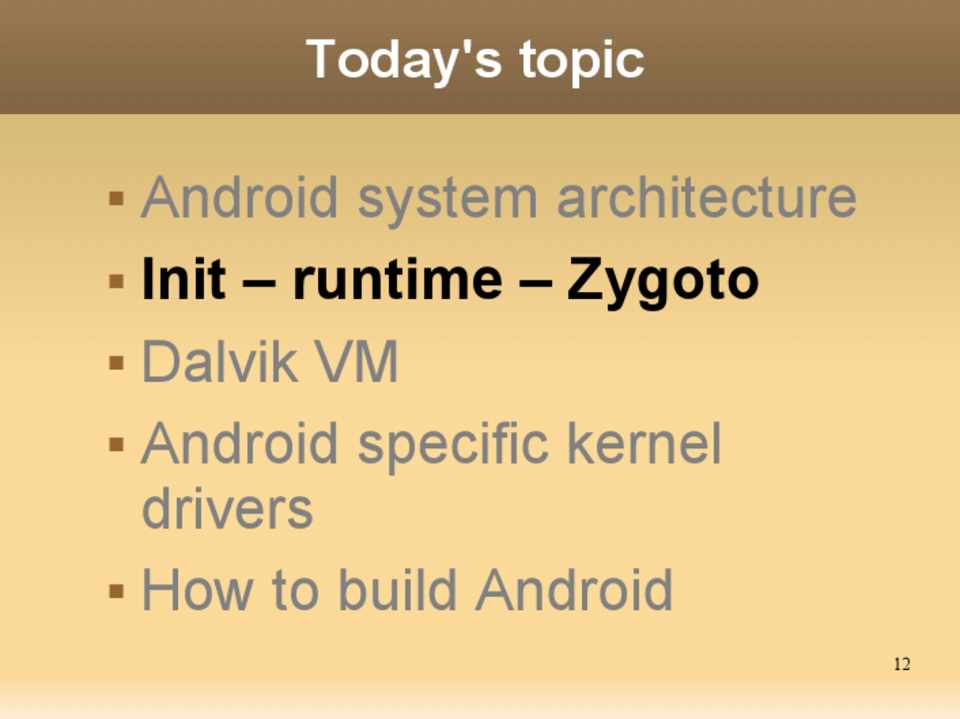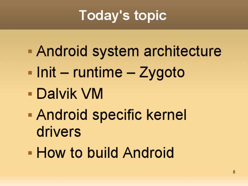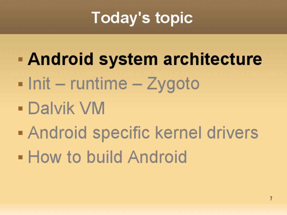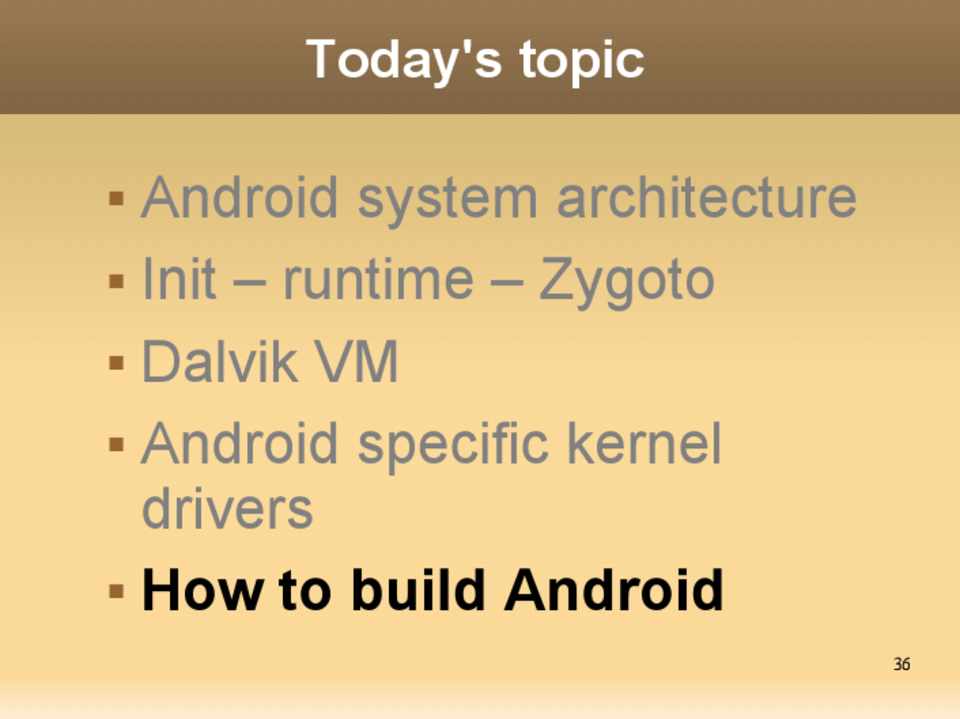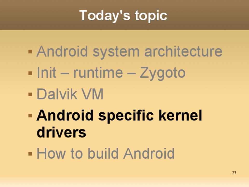 Android system architecture Init – runtime – Zygoto Dalvik VM Android specific kernel drivers How to build Android