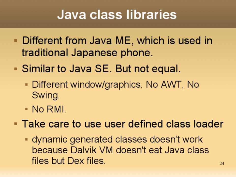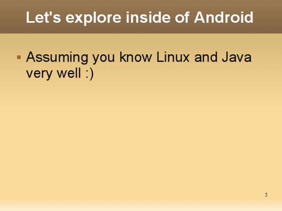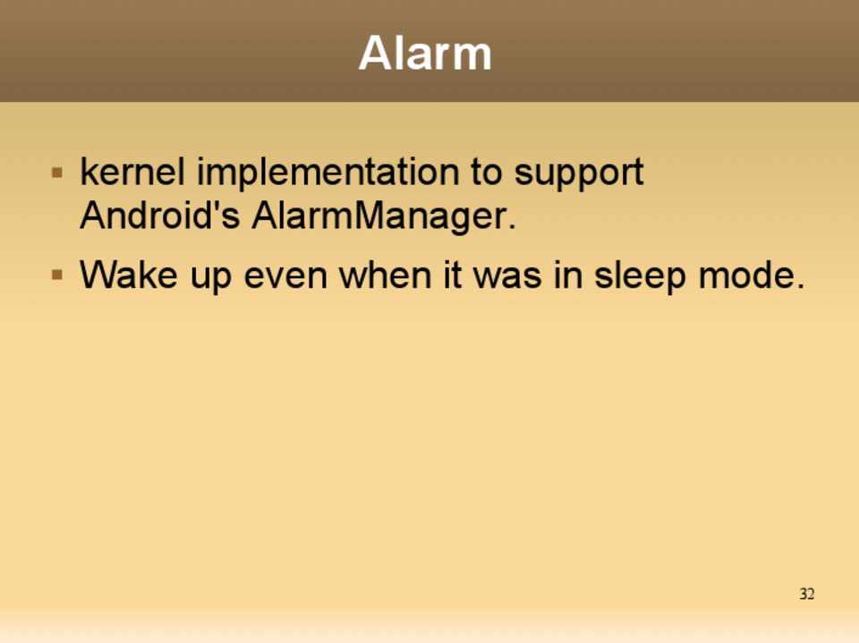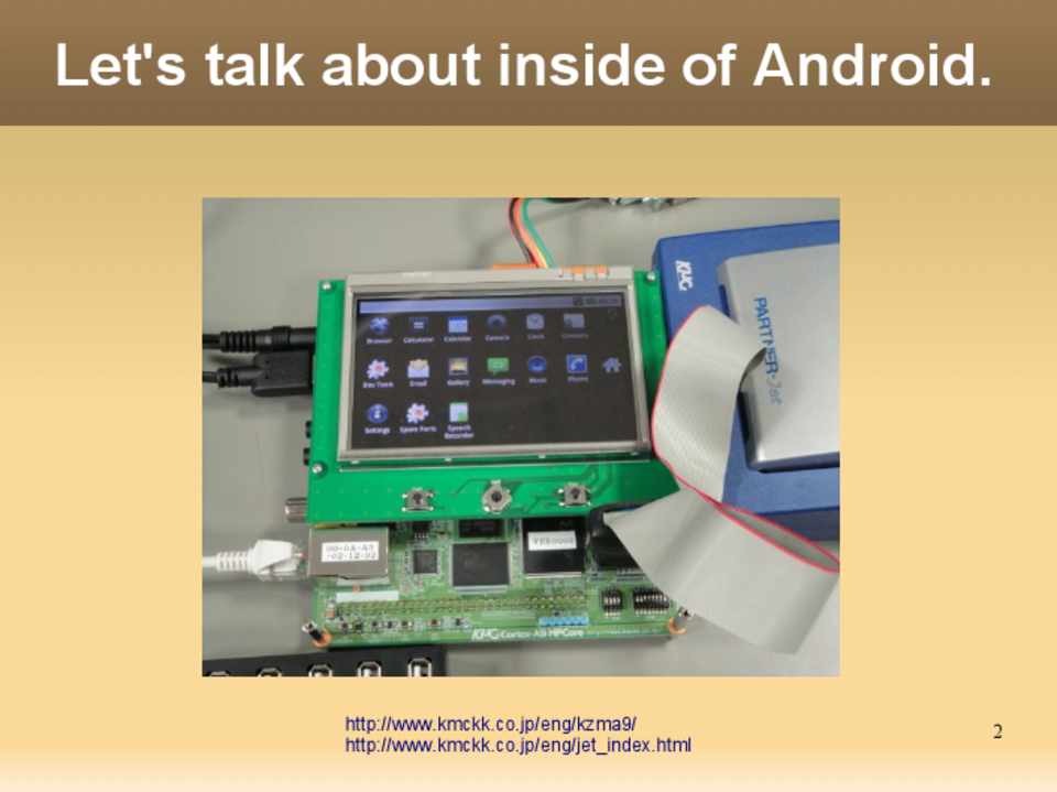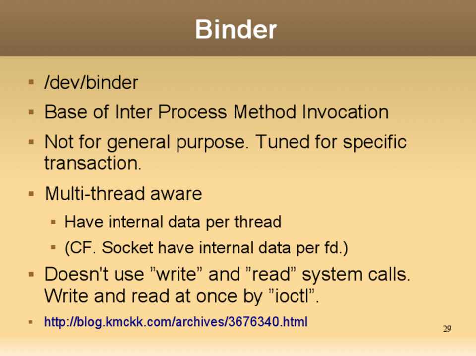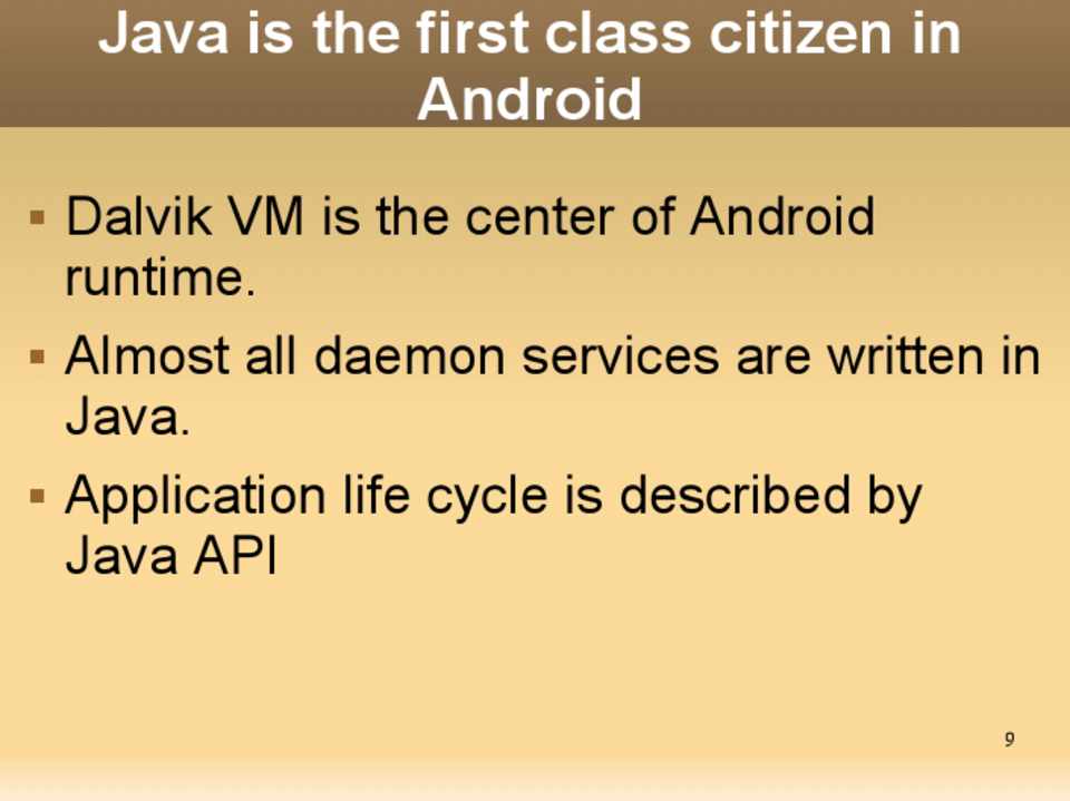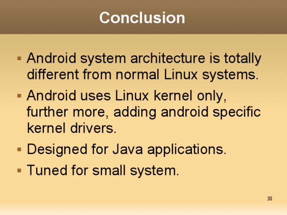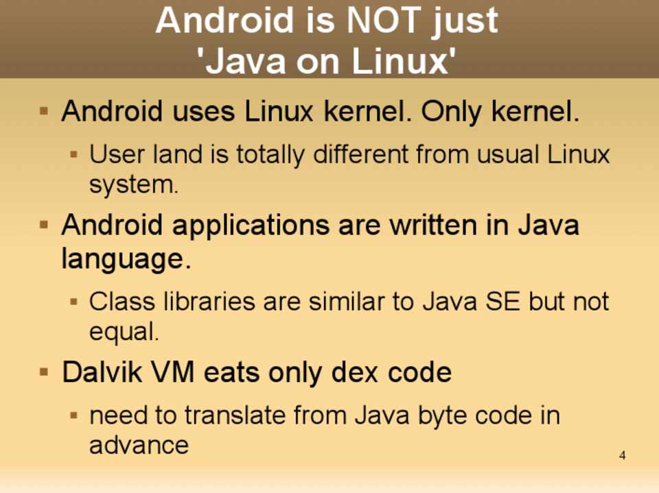 Android system architecture Init – runtime – Zygoto Dalvik VM Android specific kernel drivers How to build Android