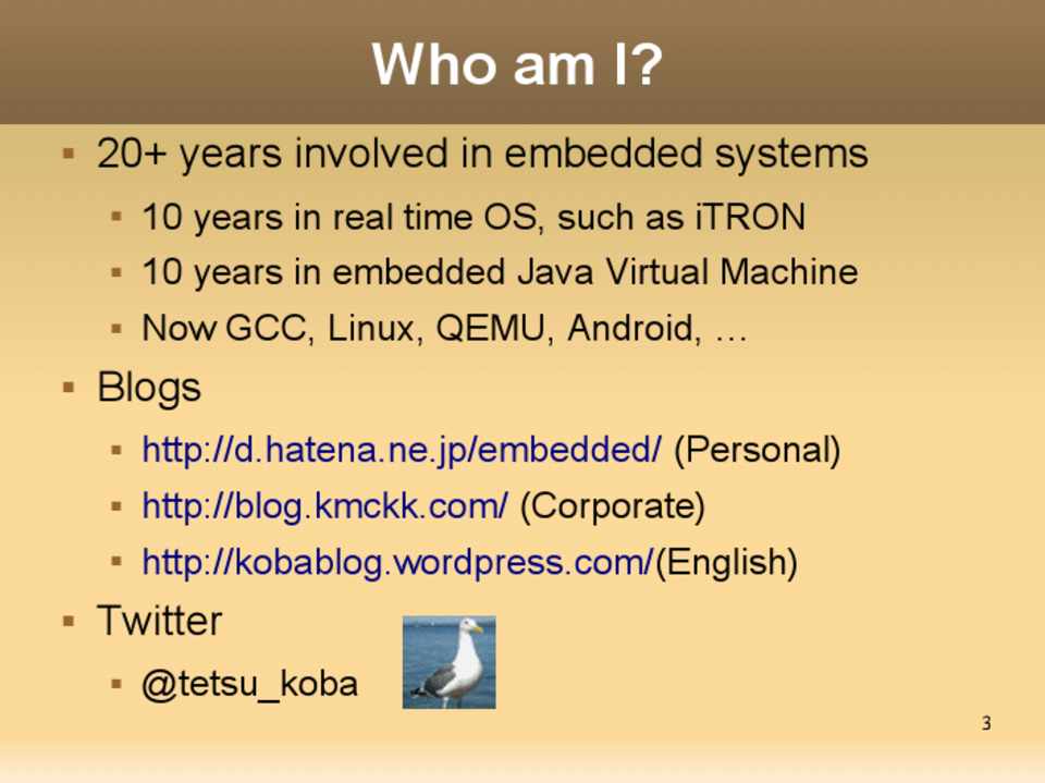 10 years in real time OS, such as iTRON 10 years in embedded Java Virtual Machine Now GCC, Linux, QEMU, Android, …