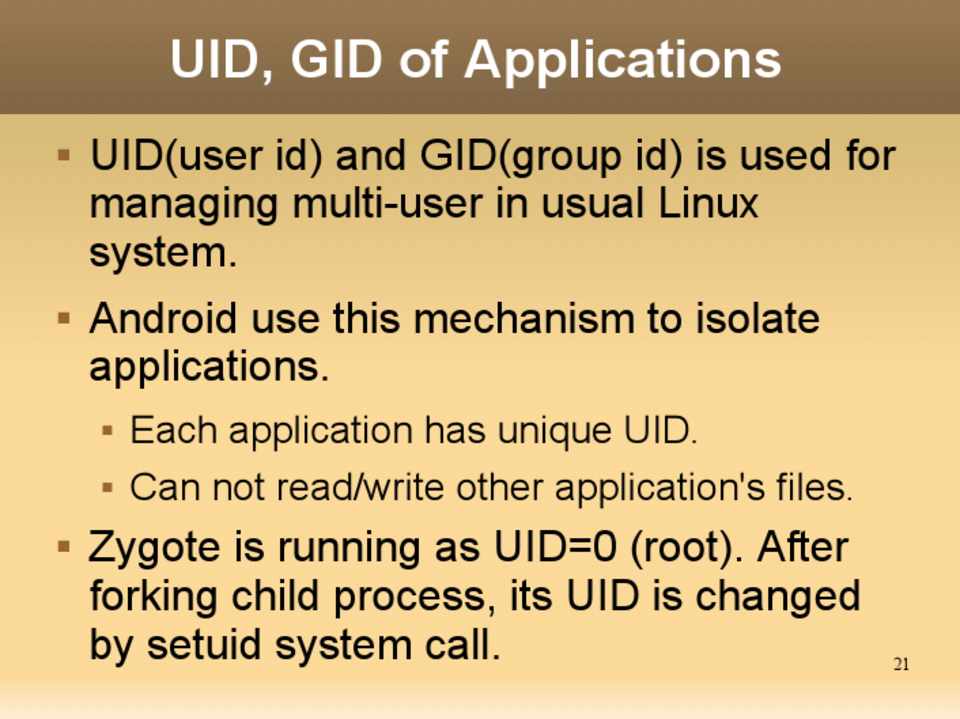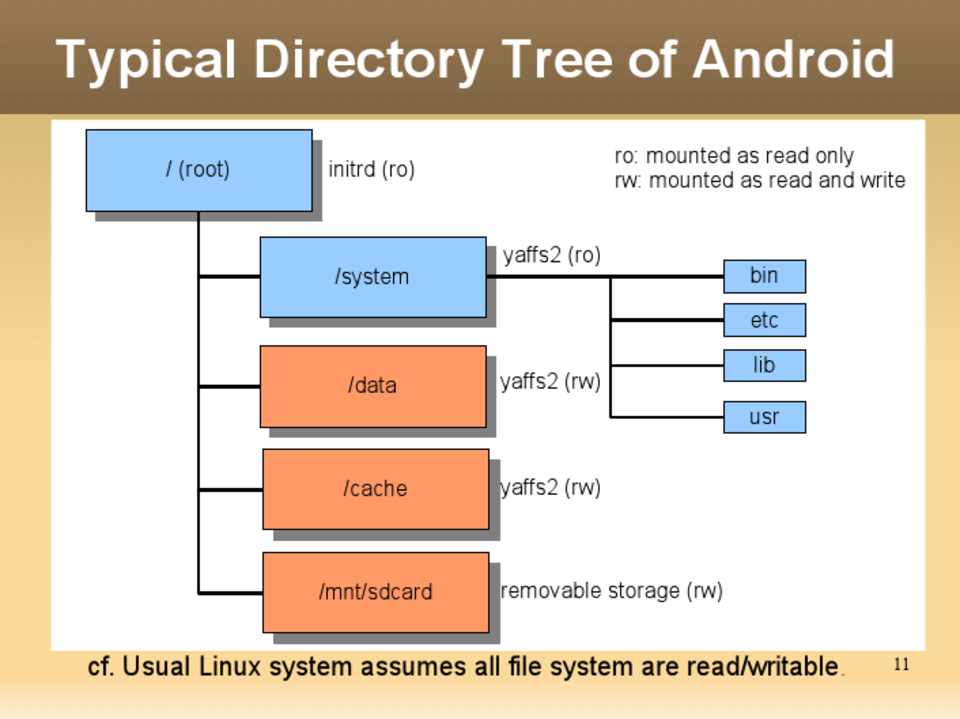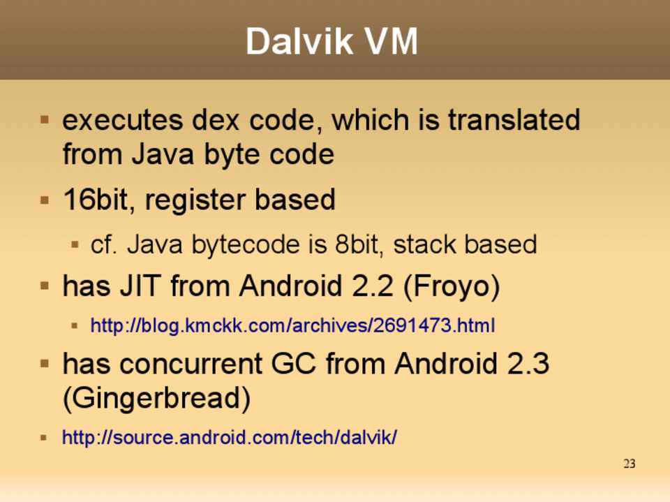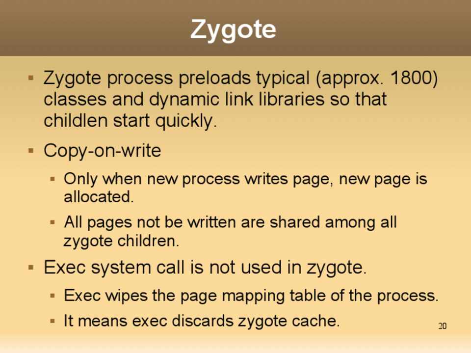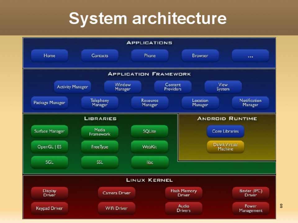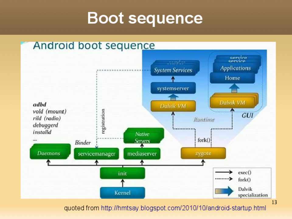 Android system architecture Init – runtime – Zygoto Dalvik VM Android specific kernel