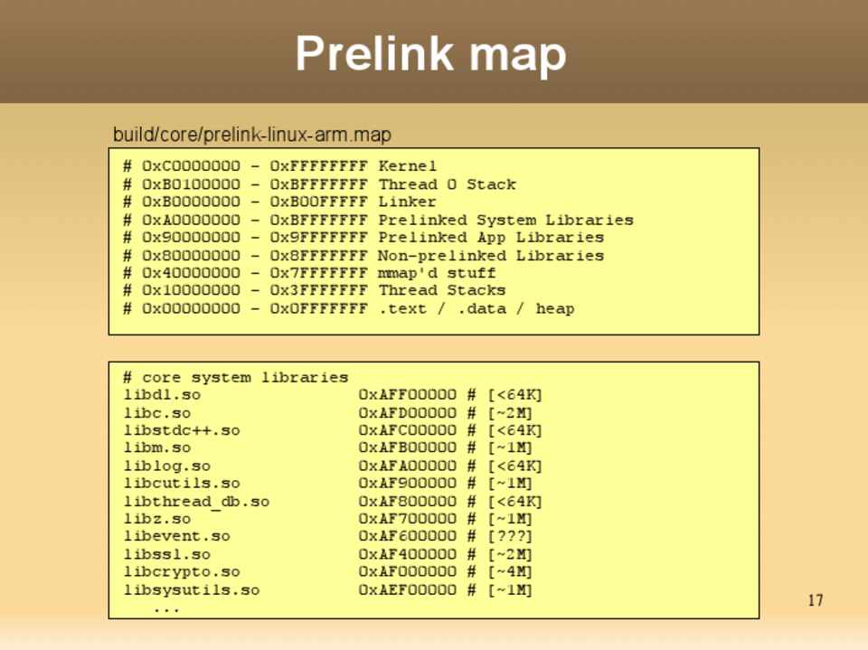 # 0xC0000000 - 0xFFFFFFFF Kernel # 0xB0100000 - 0xBFFFFFFF Thread 0 Stack # 0xB0000000 - 0xB00FFFFF Linker # 0xA0000000 - 0xBFFFFFFF Prelinked System Libraries # 0x90000000 - 0x9FFFFFFF Prelinked App Libraries # 0x80000000 - 0x8FFFFFFF Non-prelinked Libraries # 0x40000000 - 0x7FFFFFFF mmap'd stuff # 0x10000000 - 0x3FFFFFFF Thread Stacks # 0x00000000 - 0x0FFFFFFF .text / .data / heap
