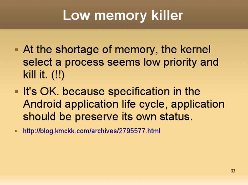 At the shortage of memory, the kernel select a process seems low priority and kill it. (!!)
