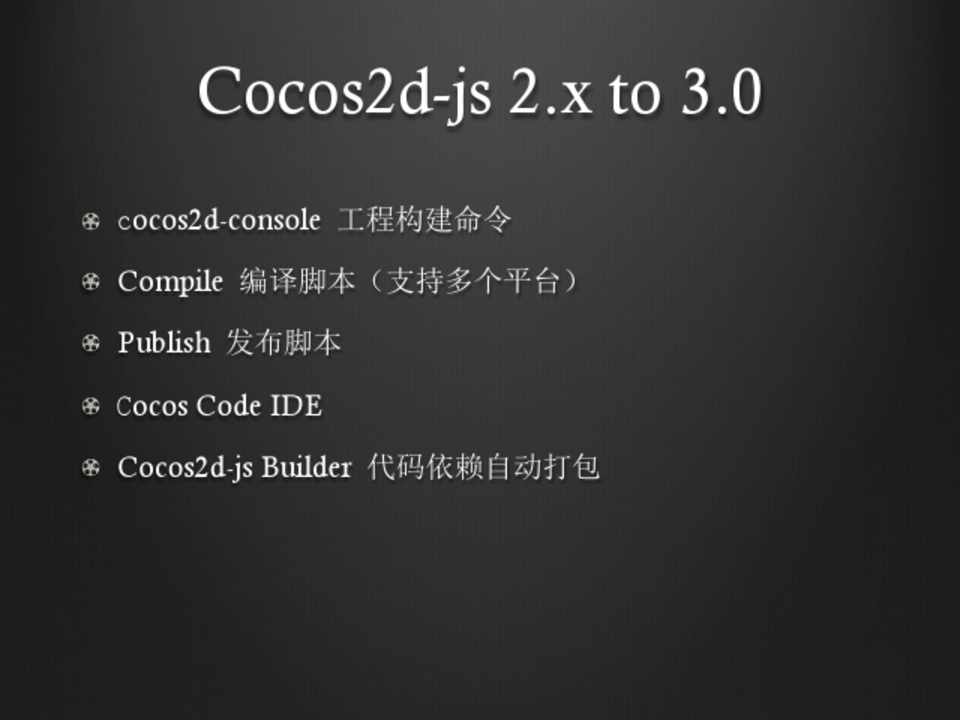 !  cocos2d-console 工程构建命令 !  Compile 编译脚本(支持多个平台) !  Publish 发布脚本 !  Cocos Code IDE !  Cocos2d-js Builder 代码依赖自动打包