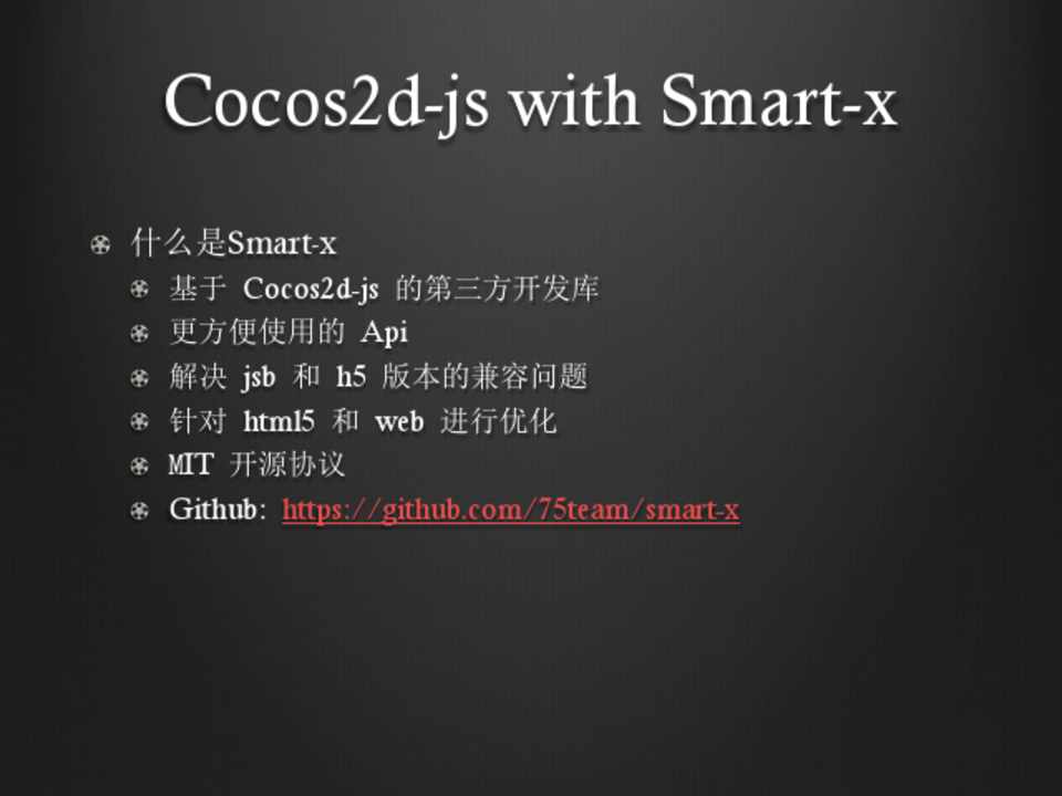 !  基于 Cocos2d-js 的第三方开发库 !  更方便使用的 Api !  解决 jsb 和 h5 版本的兼容问题 !  针对 html5 和 web 进行优化 !  MIT 开源协议 ! Github: https://github.com/75team/smart-x