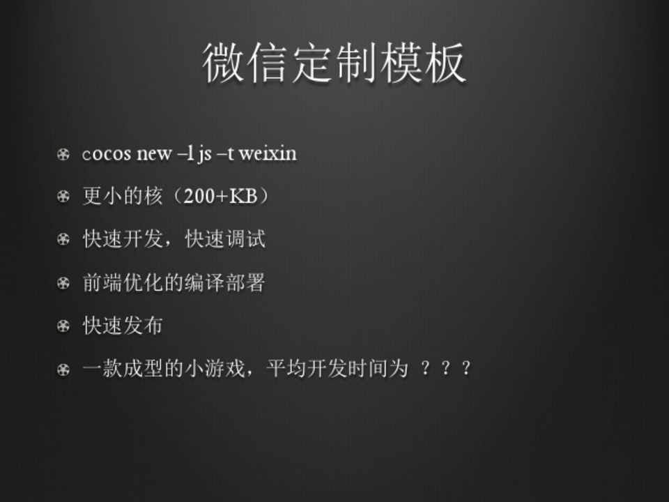 !  cocos new –l js –t weixin !  更小的核(200+KB) !  快速开发,快速调试 !  前端优化的编译部署 !  快速发布 !  一款成型的小游戏,平均开发时间为 ???