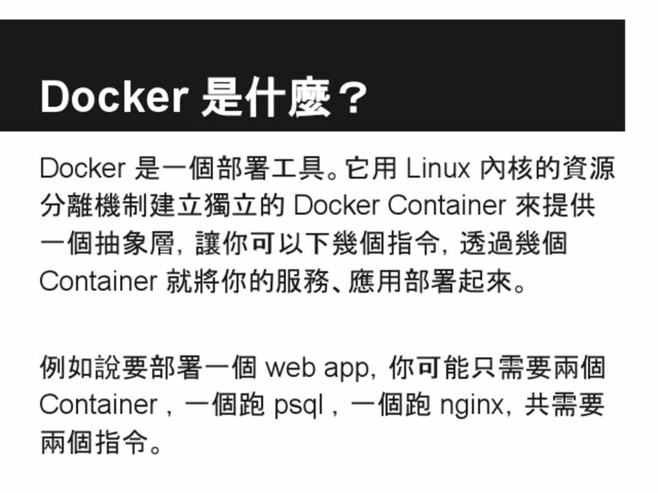 Docker 是一個部署工具。它用 Linux 內核的資源 分離機制建立獨立的 Docker Container 來提供 一個抽象層,讓你可以下幾個指令,透過幾個 Container 就將你的服務、應用部署起來。