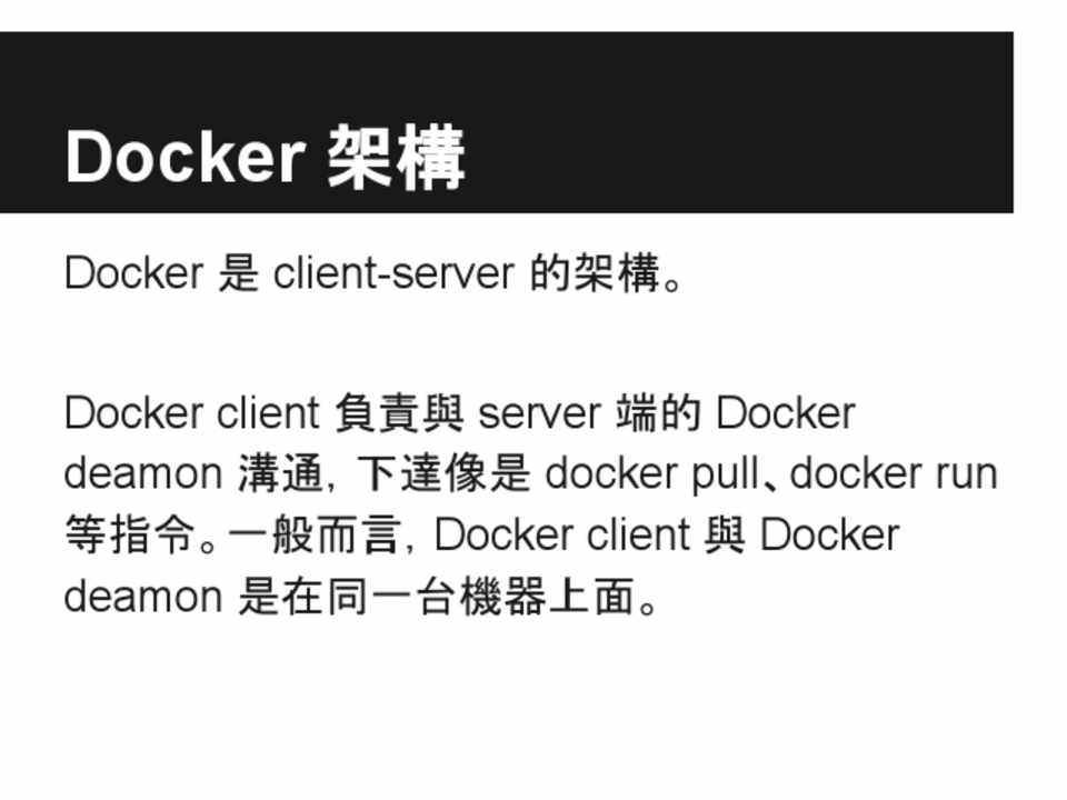 Docker client 負責與 server 端的 Docker deamon 溝通,下達像是 docker pull、docker run 等指令。一般而言,Docker client 與 Docker deamon 是在同一台機器上面。